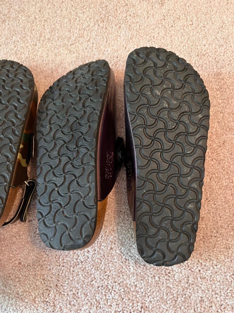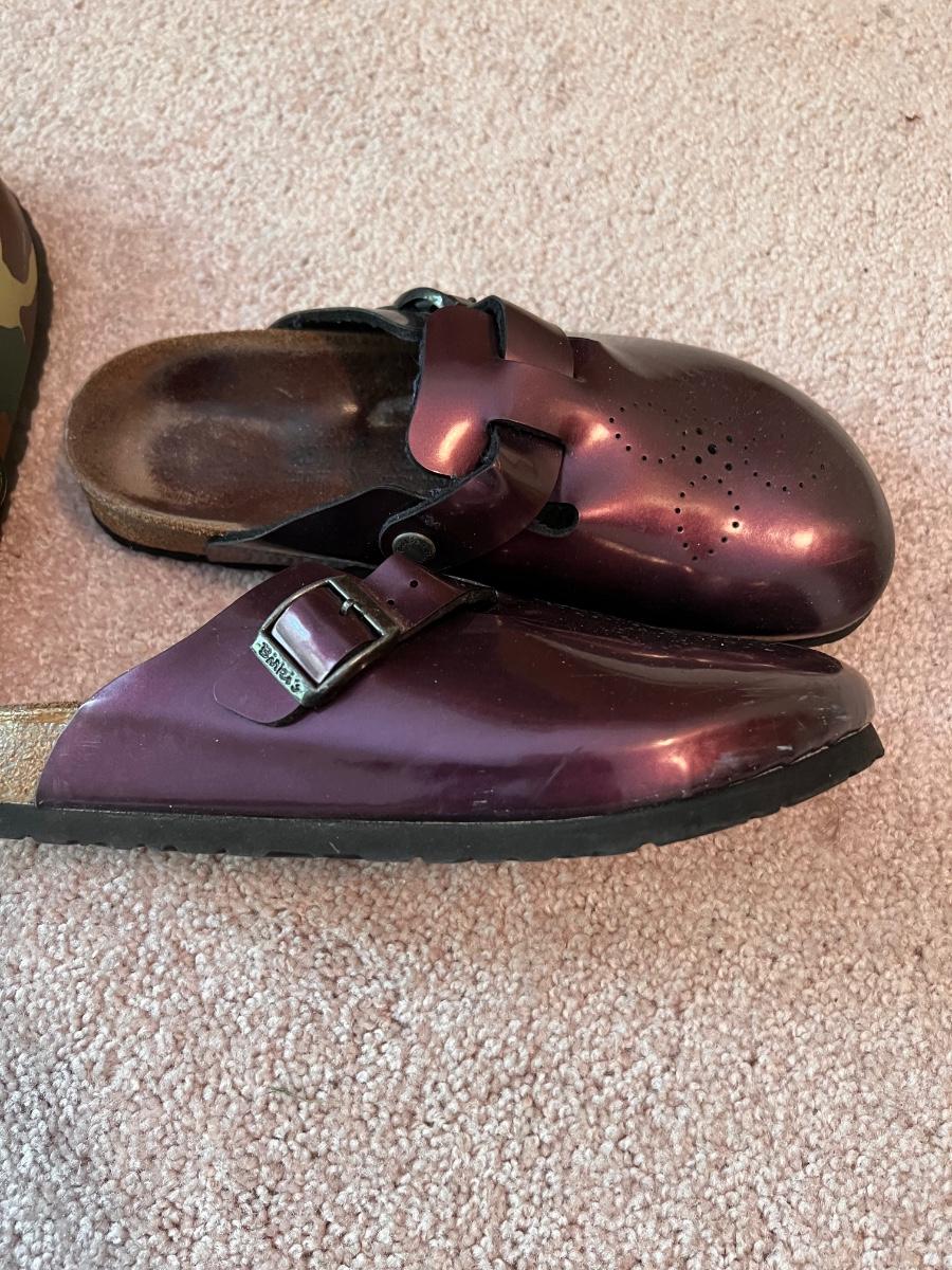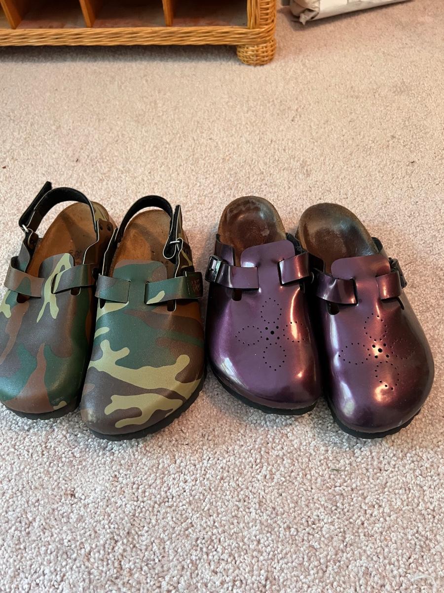 2 clogs Birko-Flor. Purple patent leather. Camo have velcro straps. In used condition. Please look at all the pictures closely to make your own assessment.