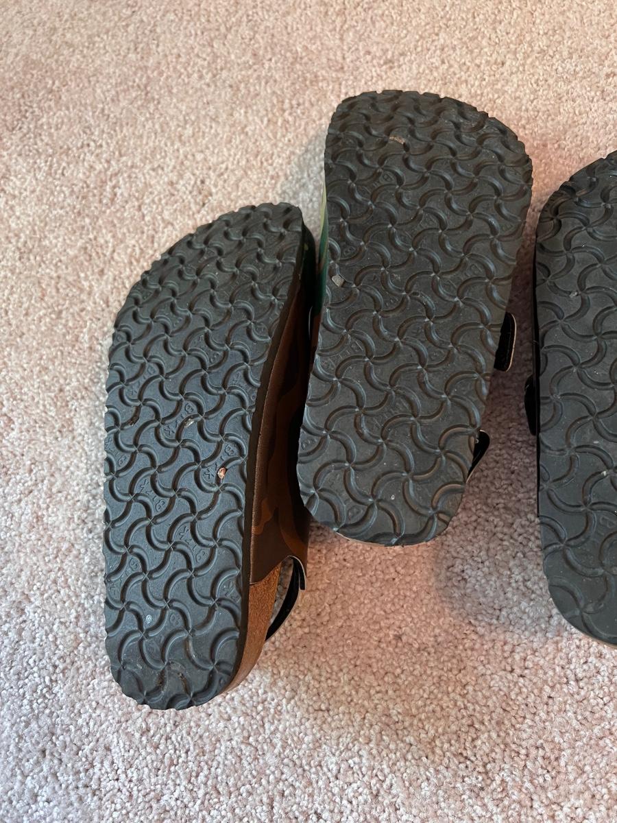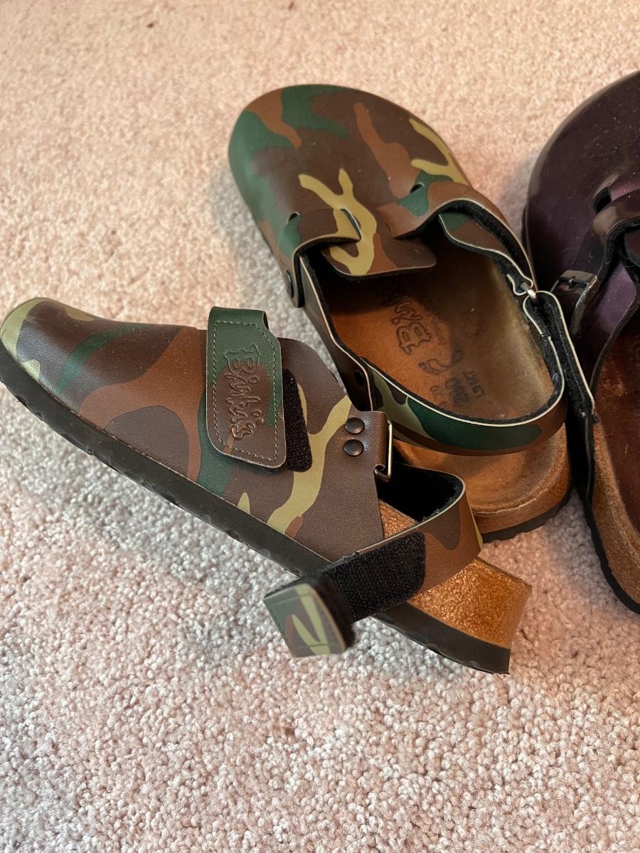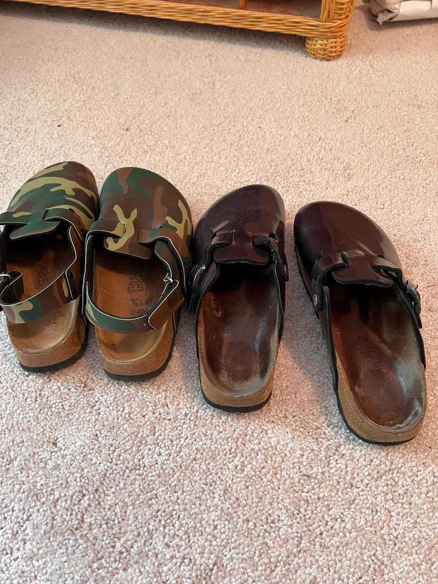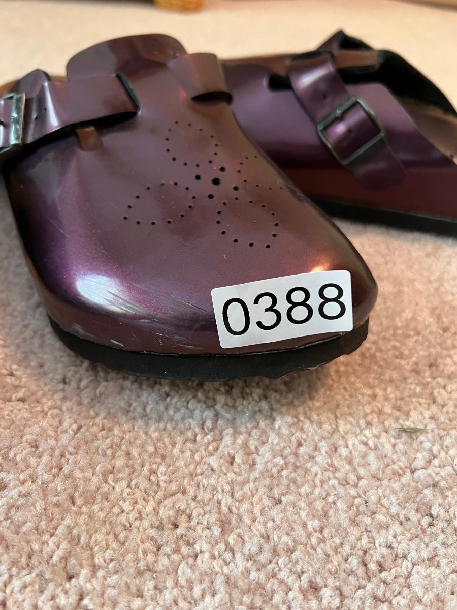2 clogs Birko-Flor. Purple patent leather. Camo have velcro straps. In used condition. Please look at all the pictures closely to make your own assessment.