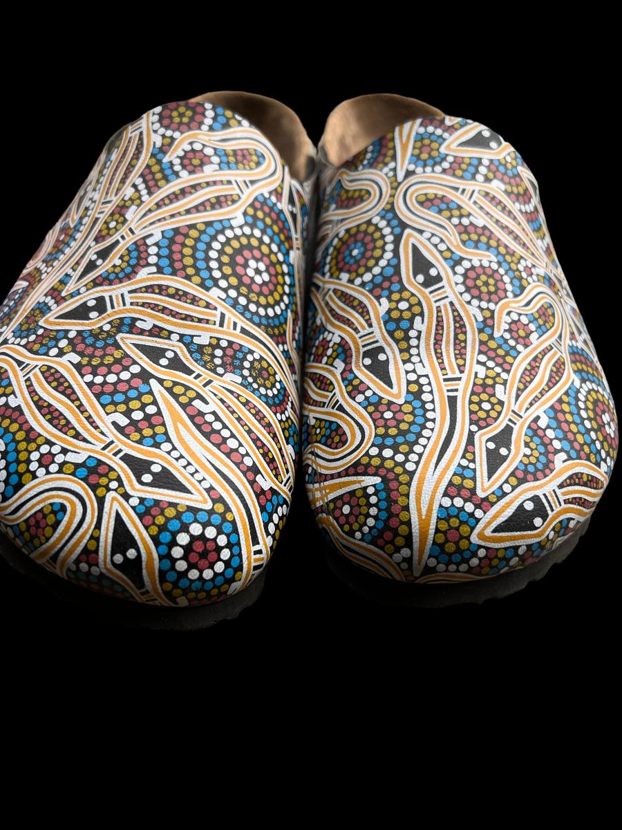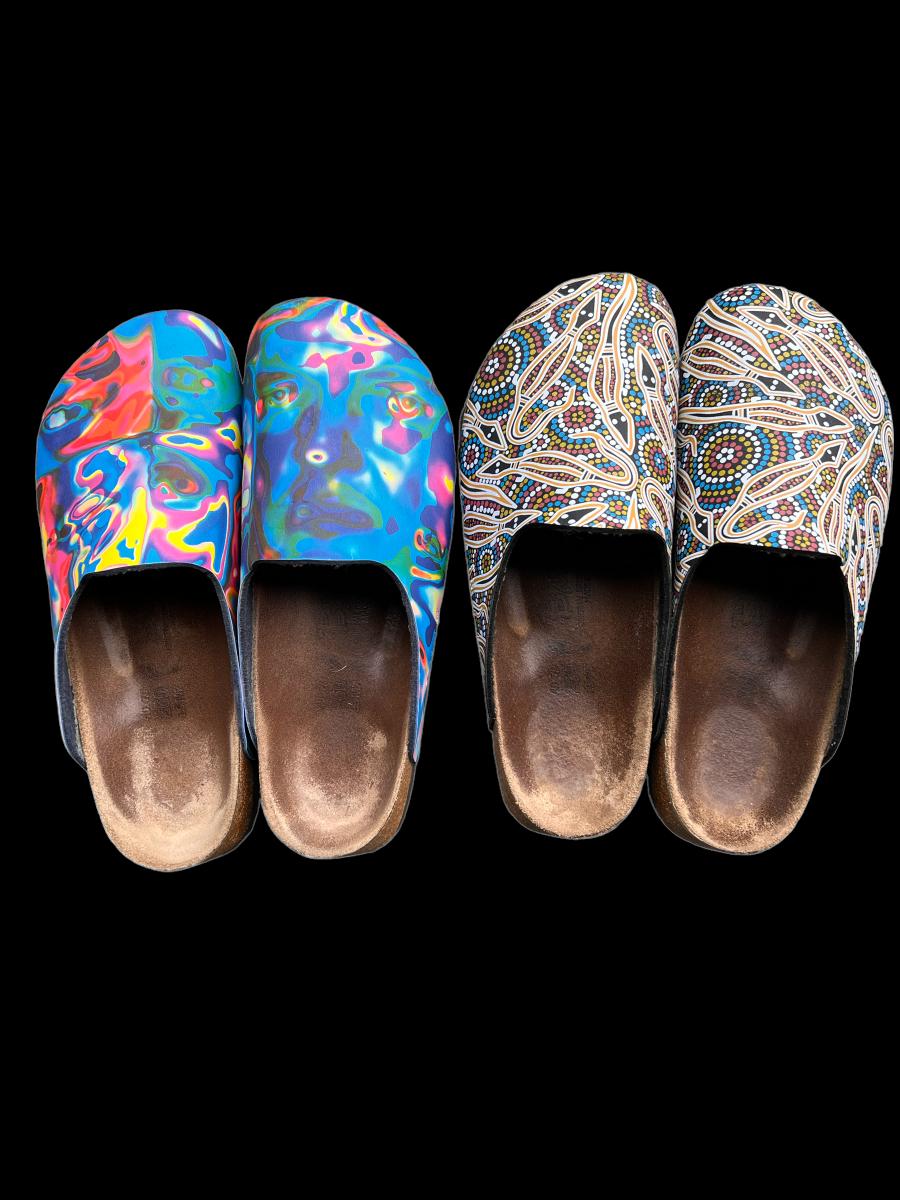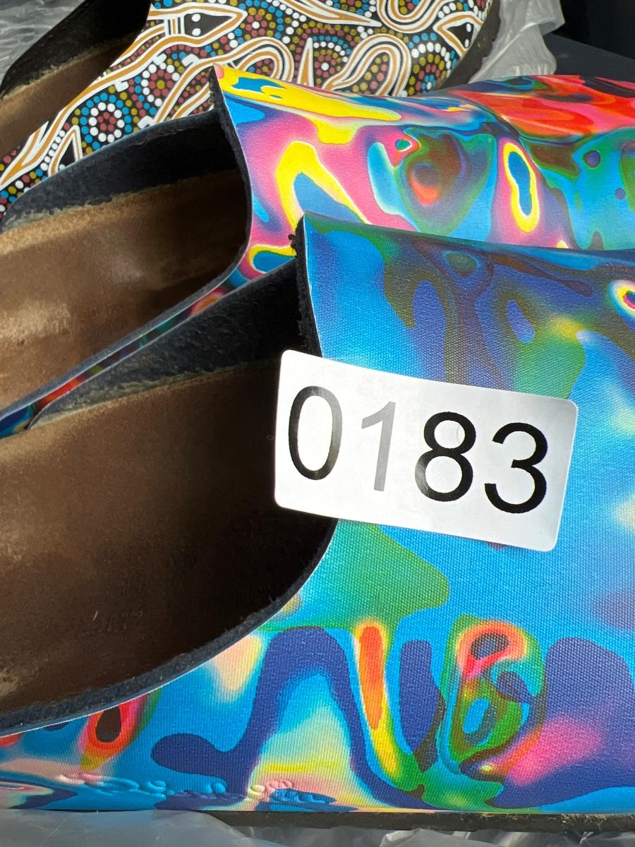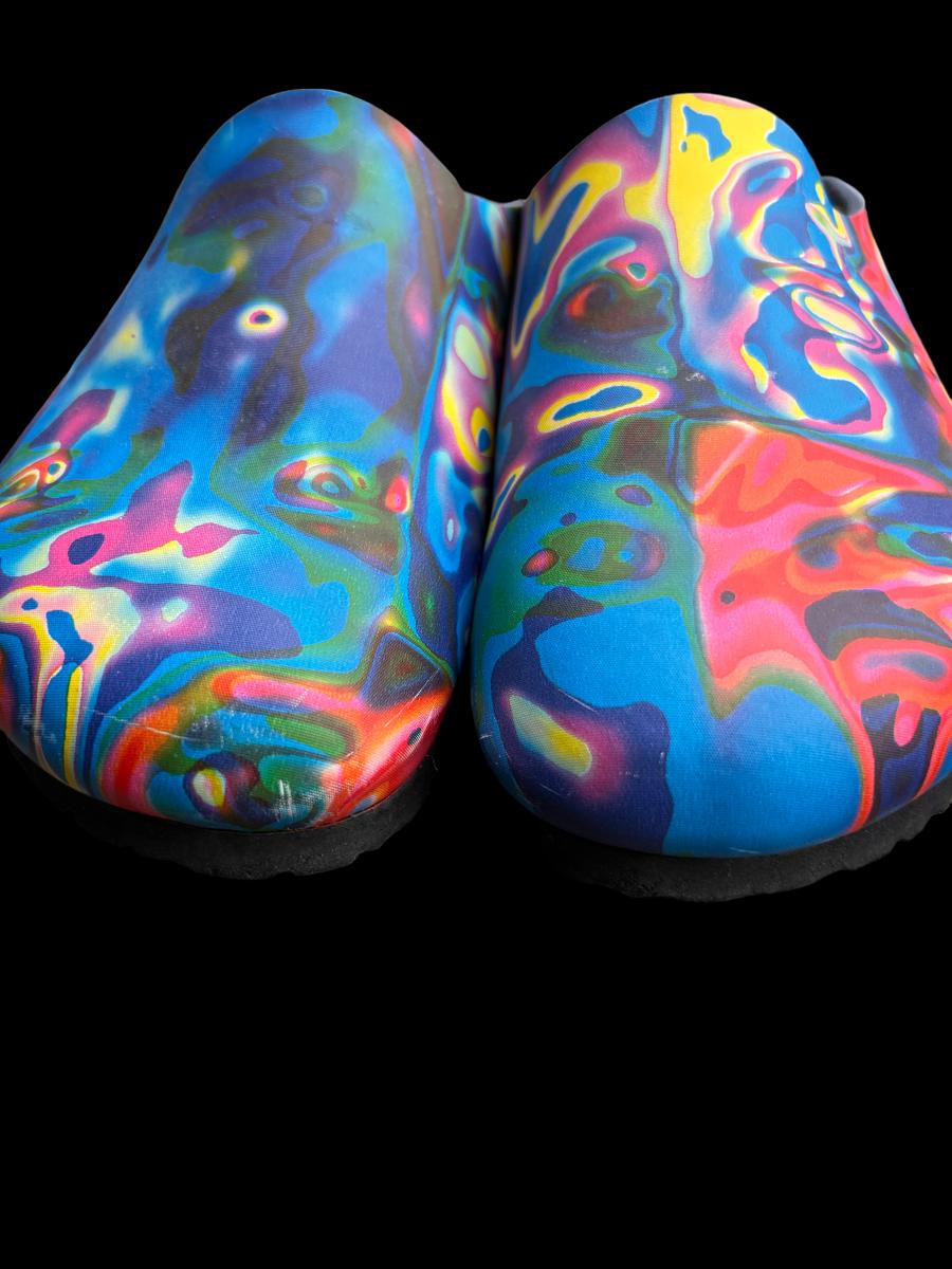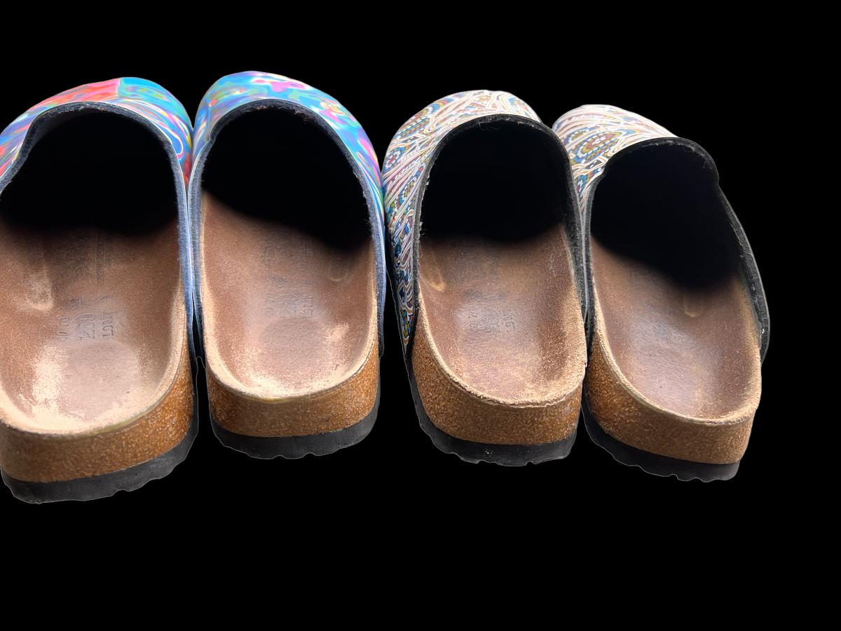 Birkis by Birkenstock Clog Psychedelic Multi Color and Birki's Birkenstock Birkoflor Printed. Seem to be in good used condition. See all pics