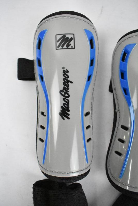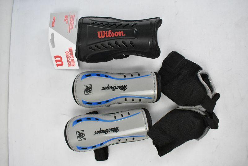 2 pairs Kids Size Shin Guards, Black/Gray/Blue by MacGregor sz Small, Black & Red by Wilson sz PeeWee - New