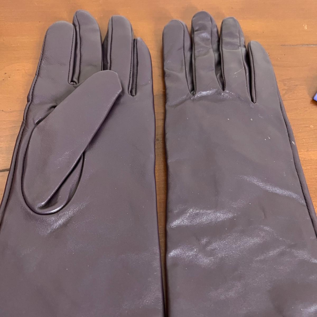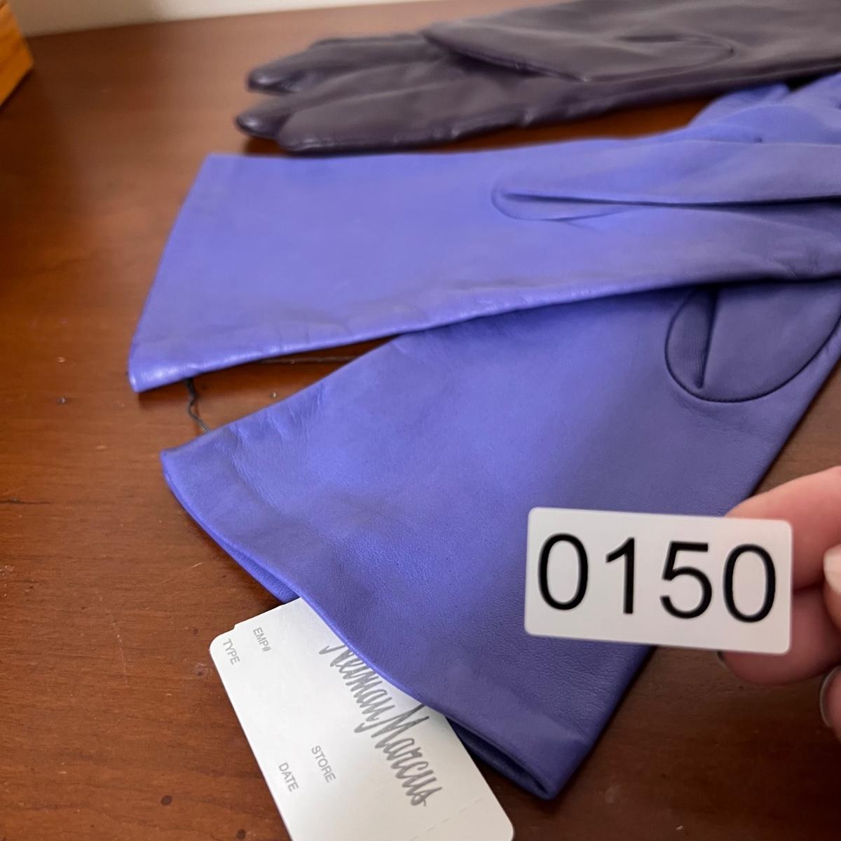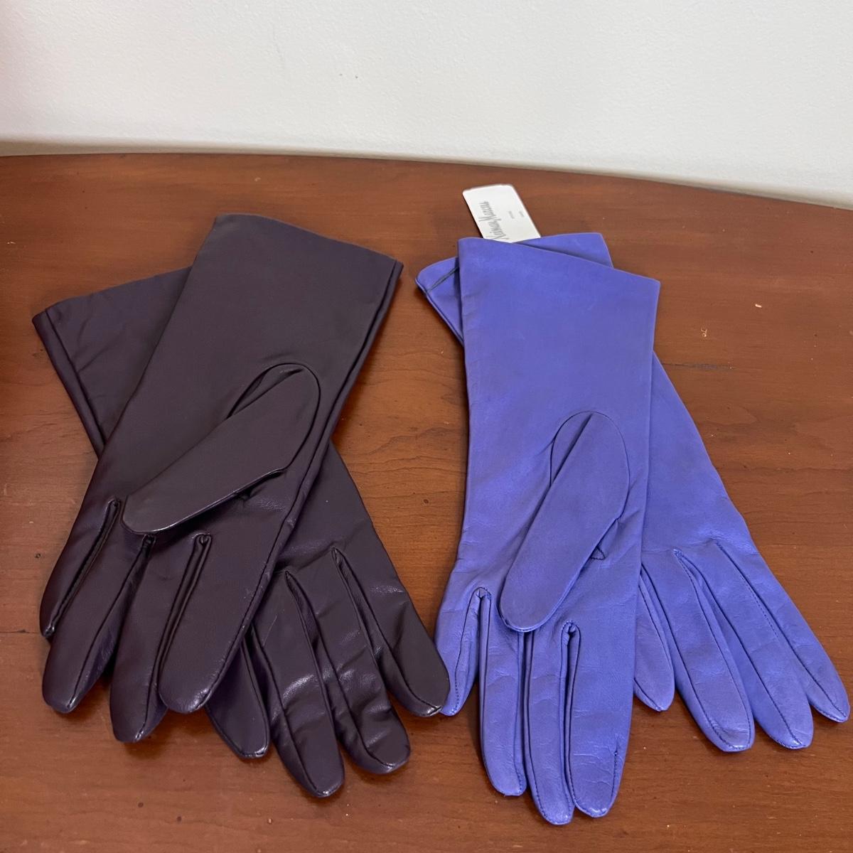 Bright purple pair of leather gloves are buttery soft. New with tags from Neiman Marcus. Pristine condition. Maroon Purple pair are gently used in very good condition. Some slight marks as shown in pictures. Might be able to be cleaned away. Fingertips are not worn.