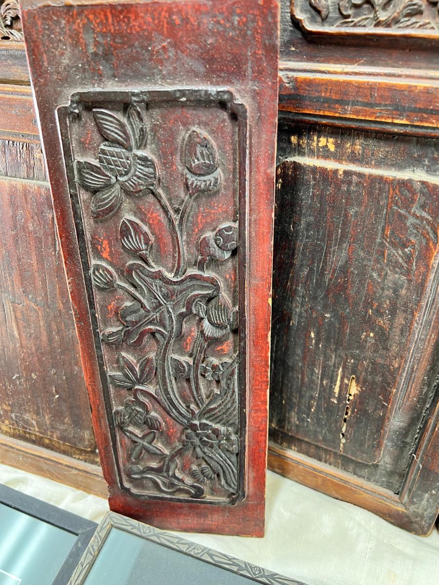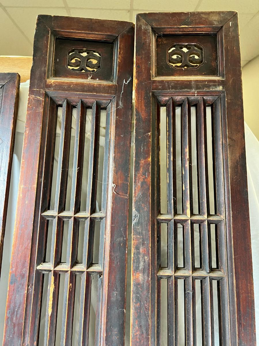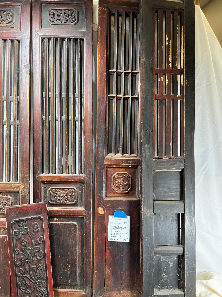 Matching rosewood carved antique [panels, 2 longer. 46" two 41" Smaller carved flower panel. perforated ceramic.