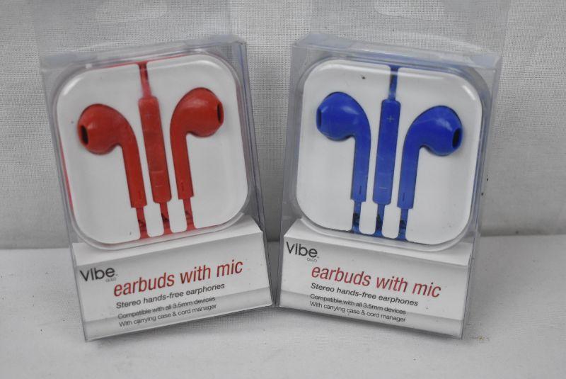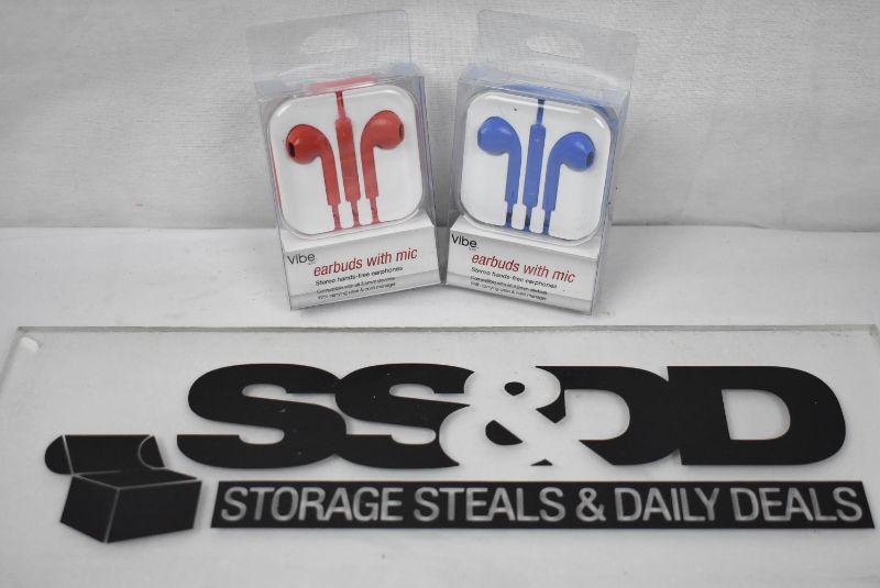 2 pairs of Earbuds with Mic for 3.5mm devices. 1 Red & 1 Blue, $16 Retail - New