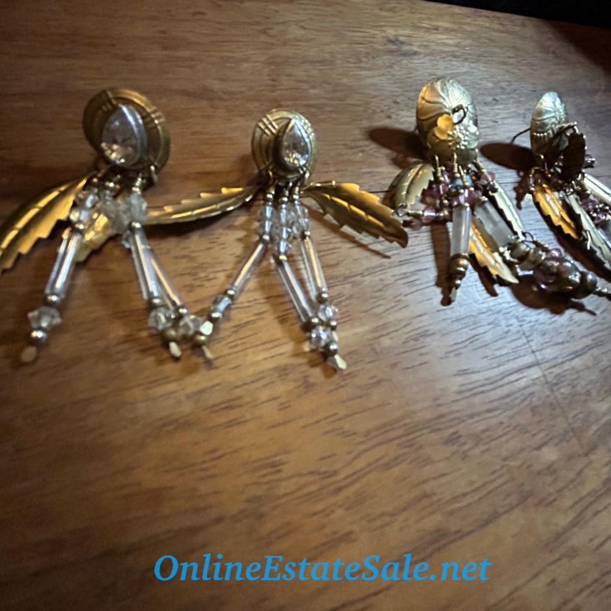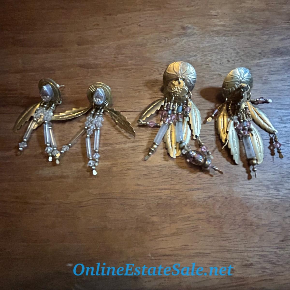 Light Gold Colored Beaded Feather Charm Earrings with Metal Detail