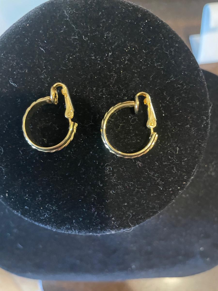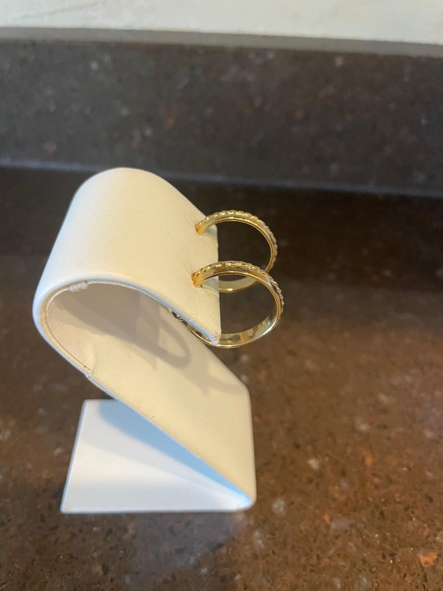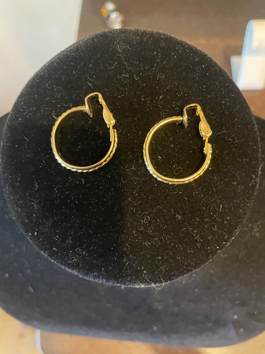 2 pairs of gold hoop earrings. 1 is slightly smaller than the other.