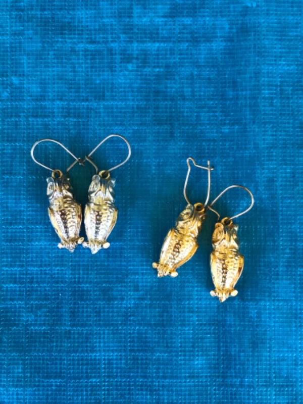 2 pairs of owls earring. Made for pierced ears. One gold, one silver.