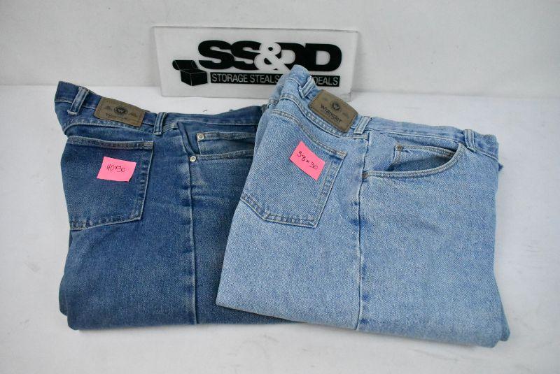2 Pairs Wrangler Jeans: Dark Wash 40x30 Light Wash 38x30