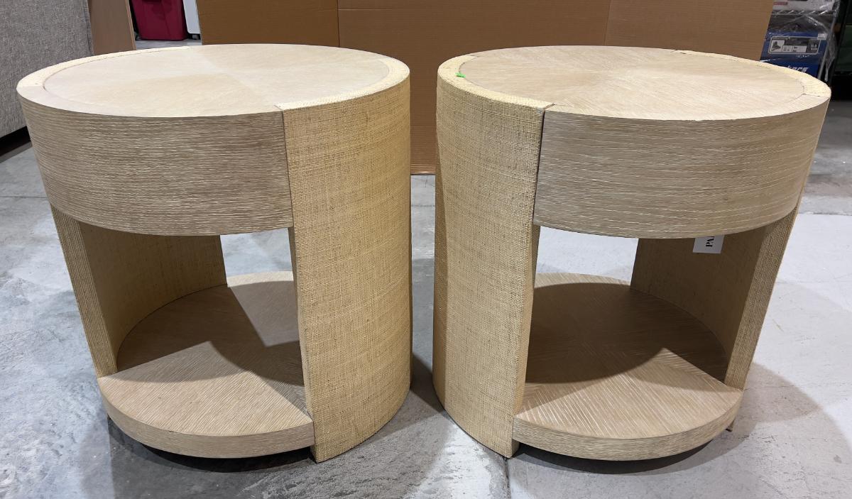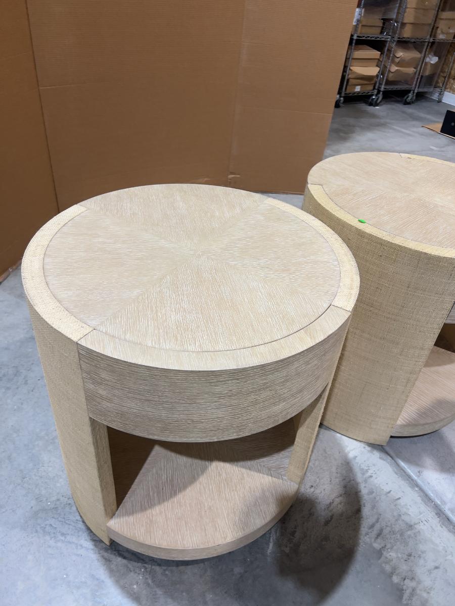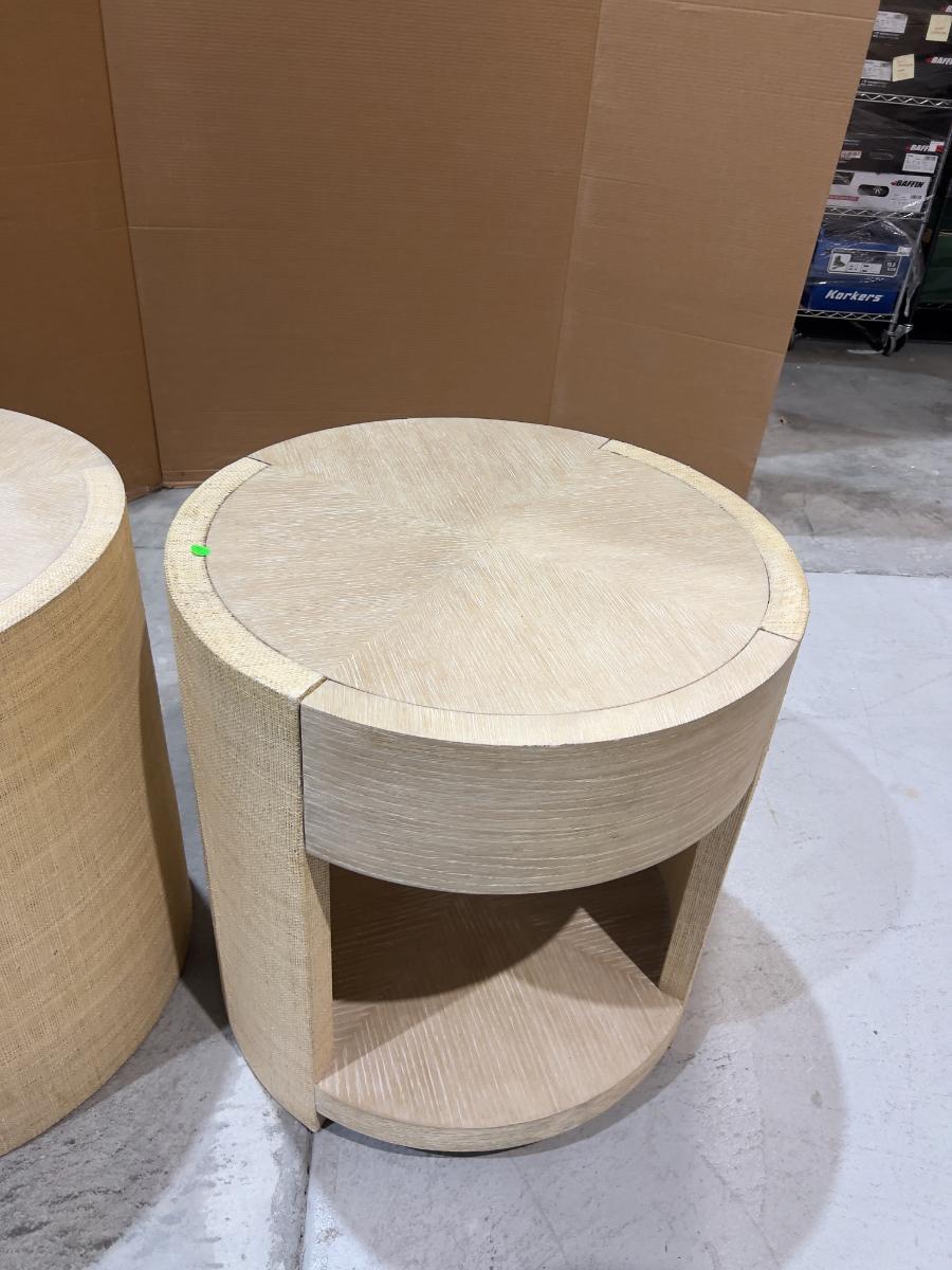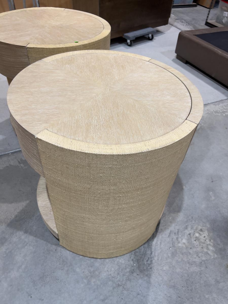 Venon Round Night Stands with Drawers. Each one has water damage on the burlap. Moisture Damage - See photos. Designer. Please provider moving assistance and secure transportation and or packing materials for moving. Retail $2,160 EACH!