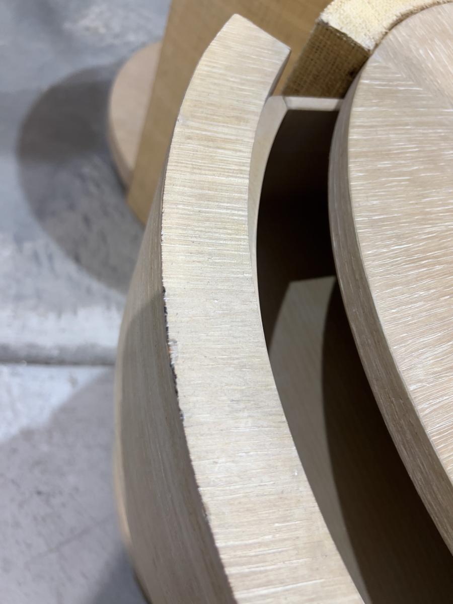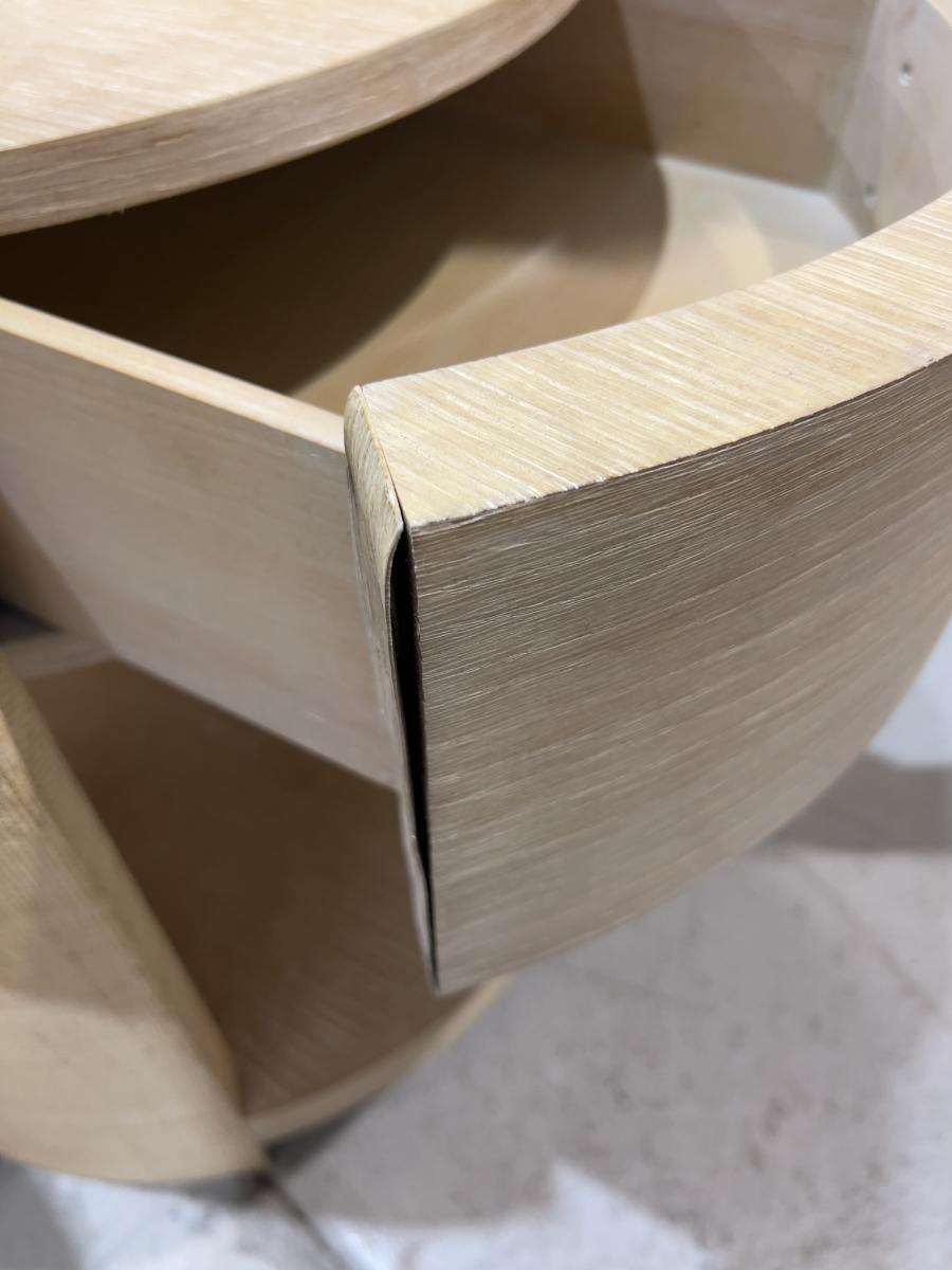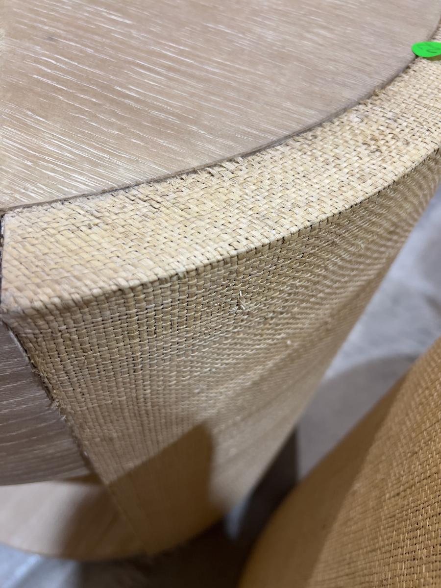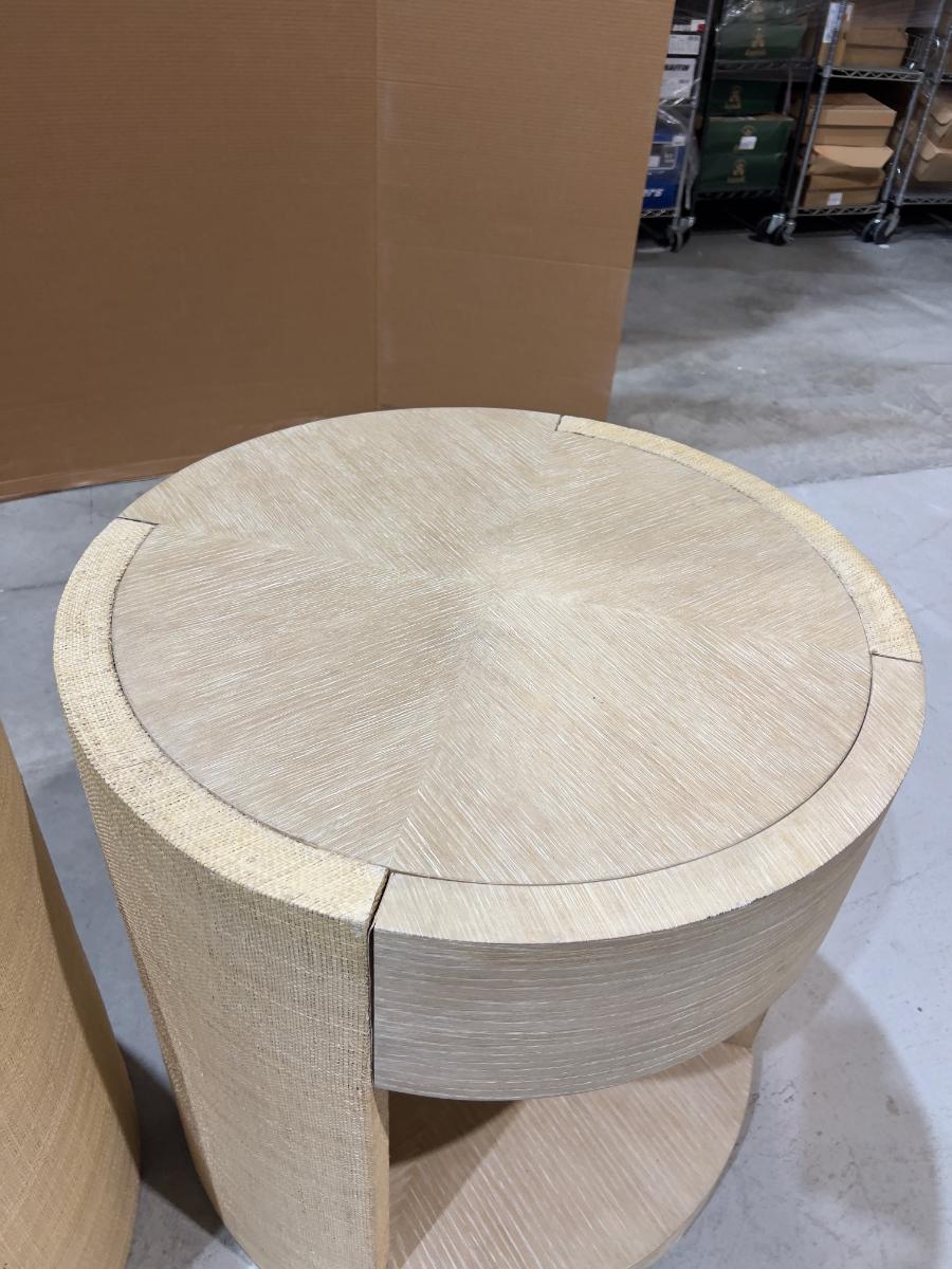 Venon Round Night Stands with Drawers. Each one has water damage on the burlap. Moisture Damage - See photos. Designer. Please provider moving assistance and secure transportation and or packing materials for moving. Retail $2,160 EACH!
