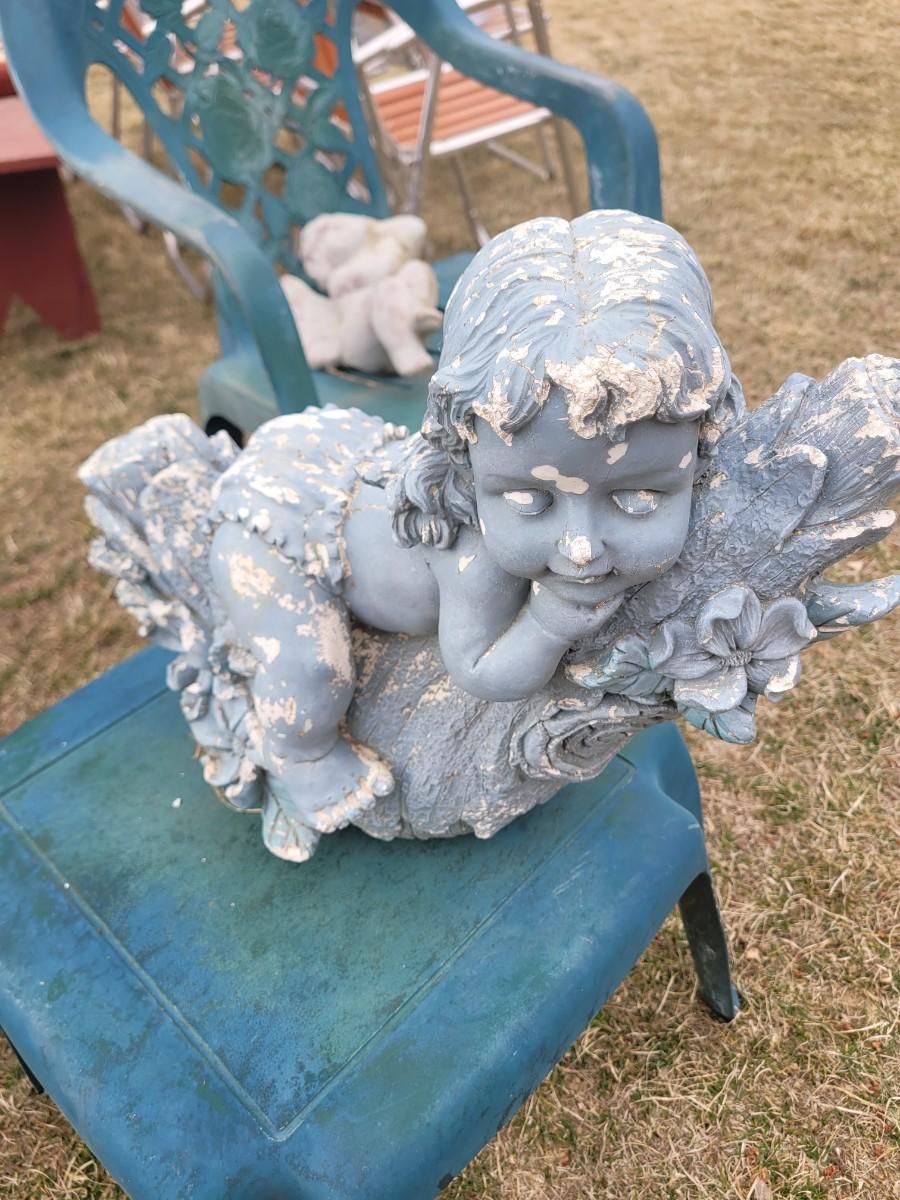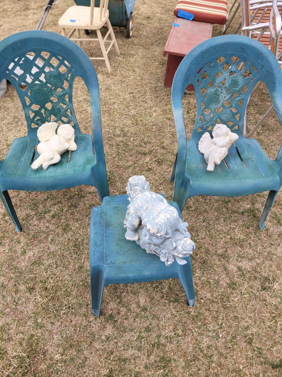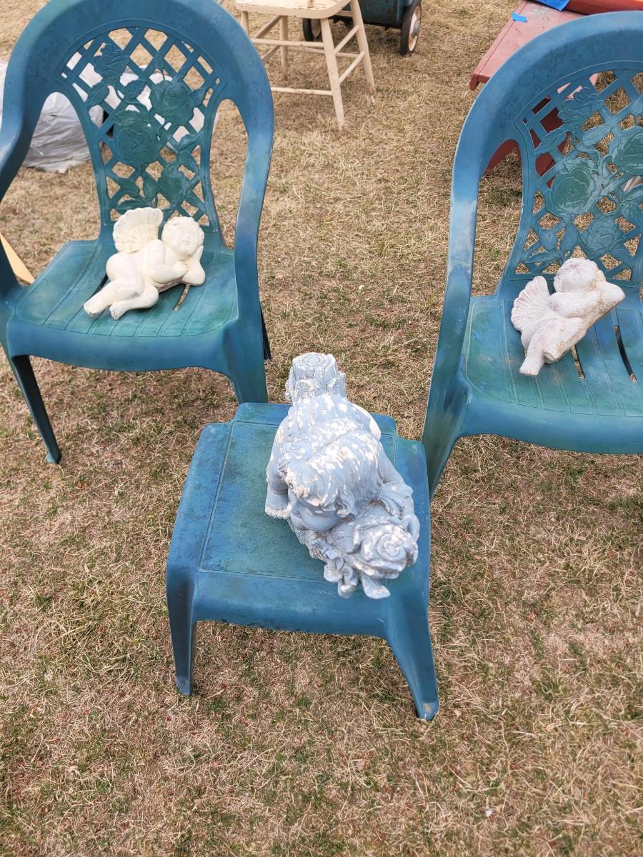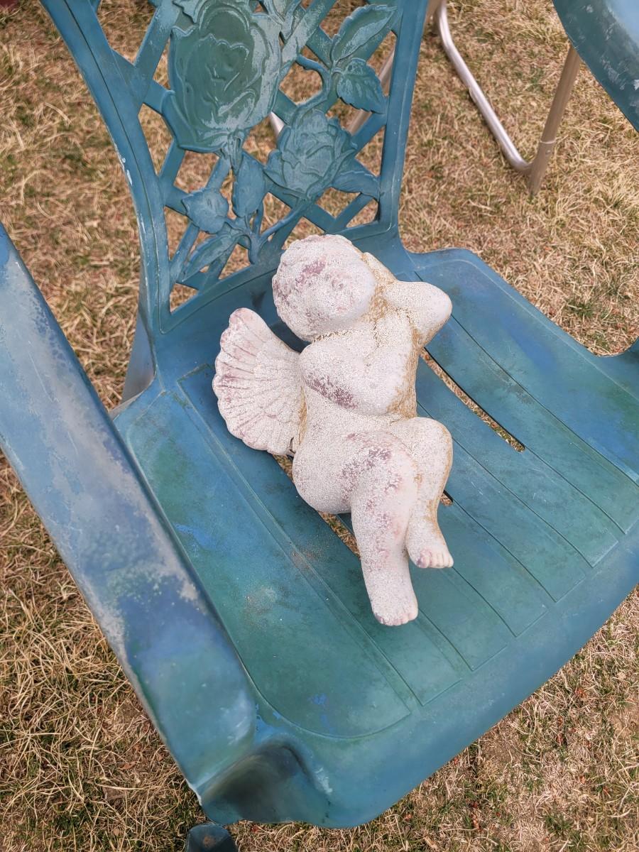 2 patio chairs, table, 2 angels and a cherub