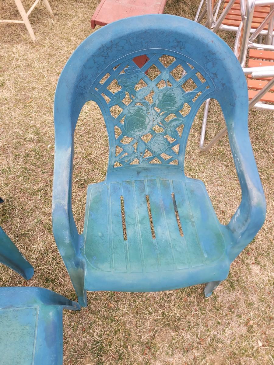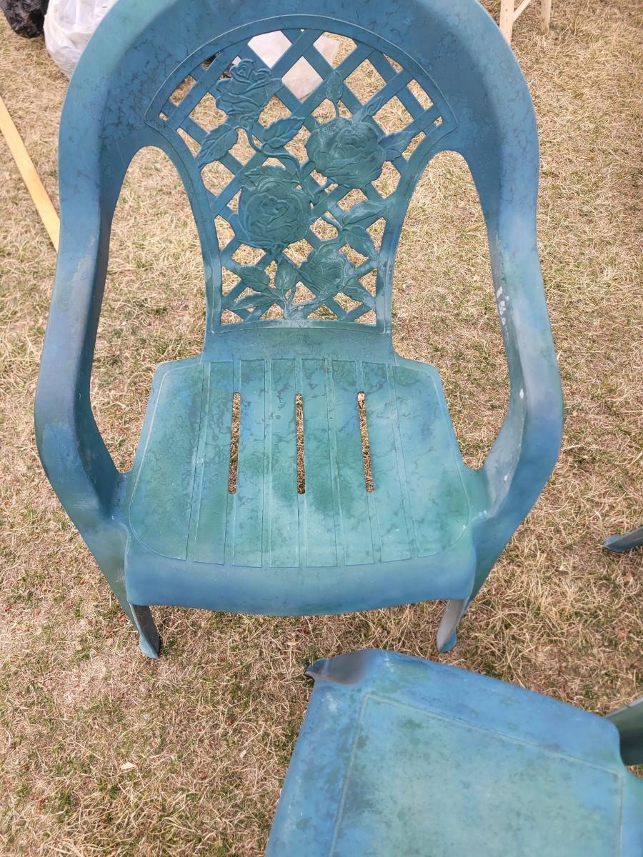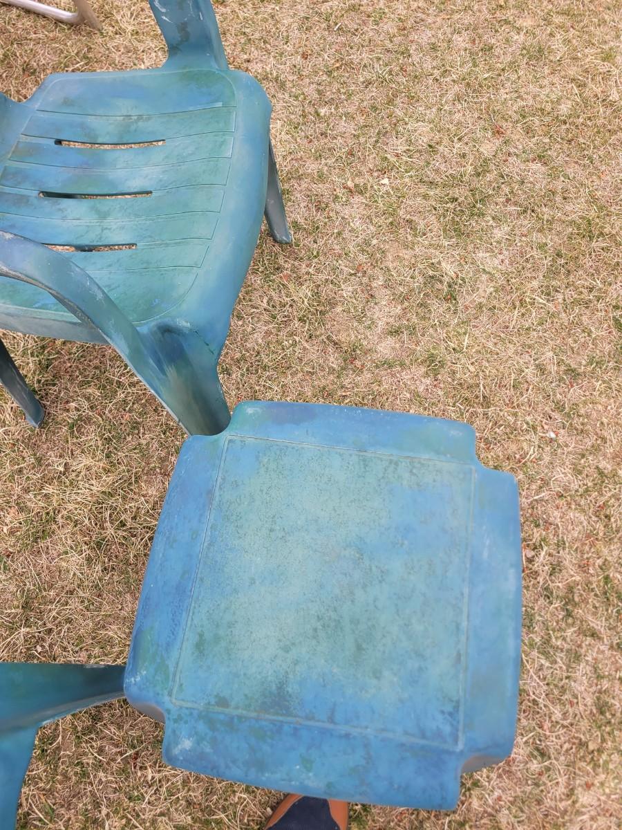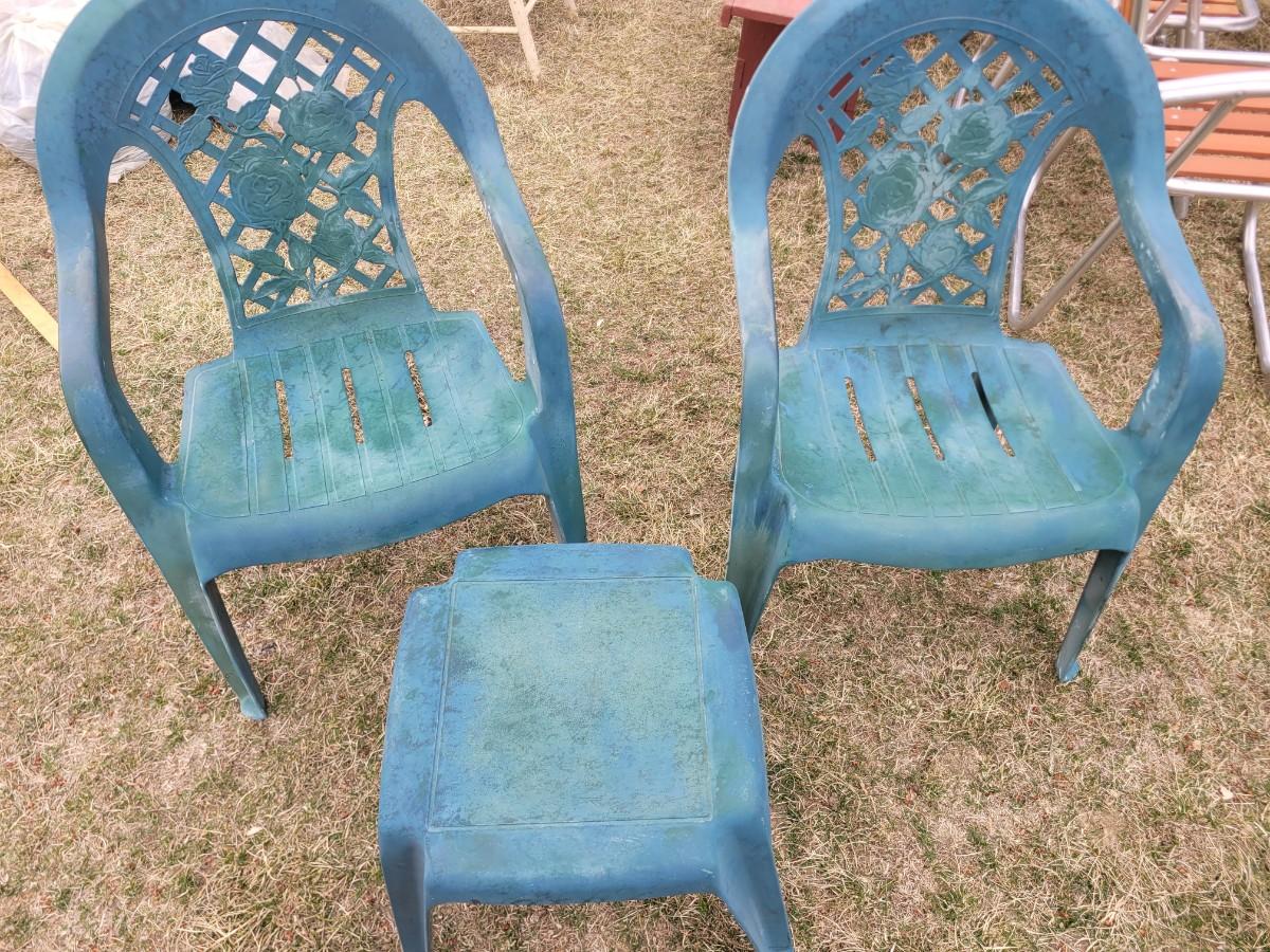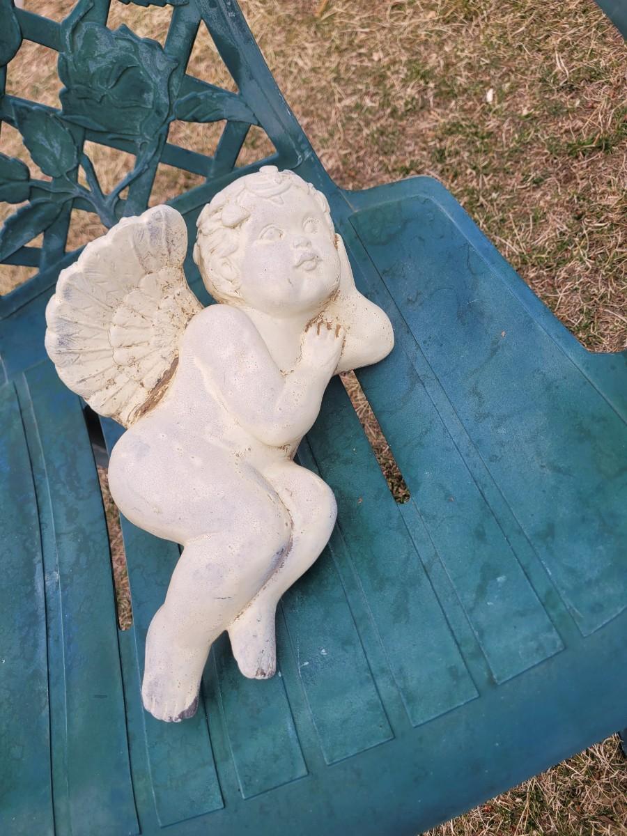2 patio chairs, table, 2 angels and a cherub