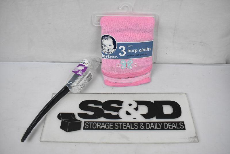 2 pc Baby: Baby Bottle, Nipple Brush, Grey & Gerber Terry Burp Cloths - New