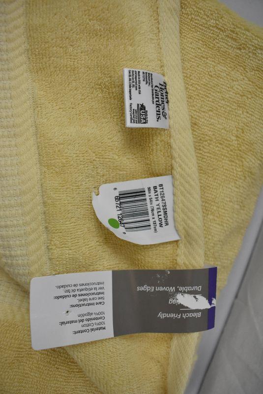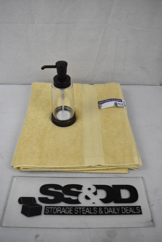 2 pc Bath: BH&G Single Bath Towel, Solid Yellow & Mainstays Lumis Clear & Bronze Soap Pump - New