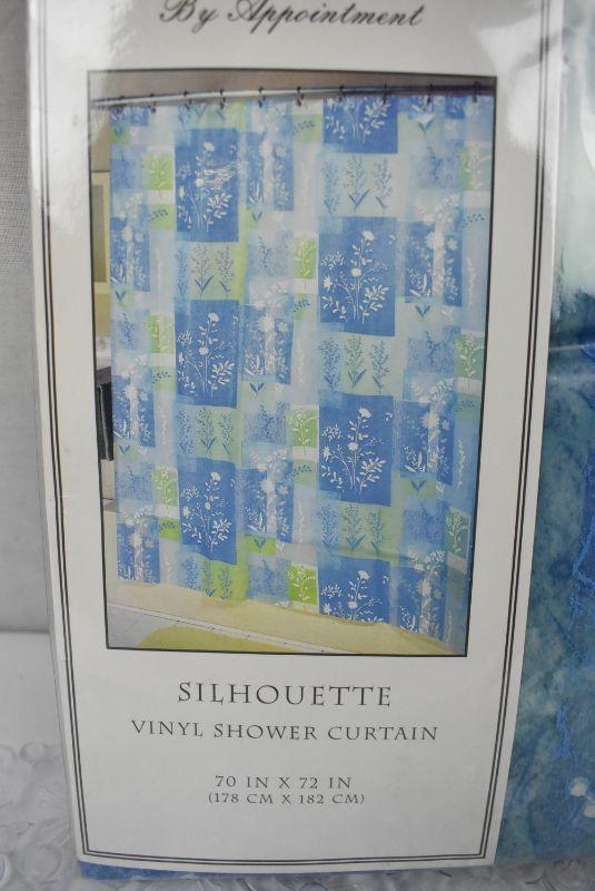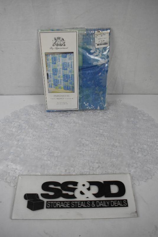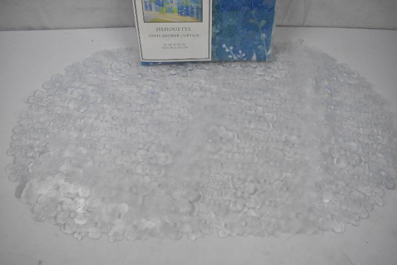 2 pc Bath: Green/Blue Floral Shower Curtain & Clear Floral Tub Mat - New