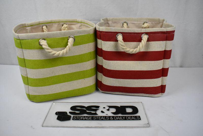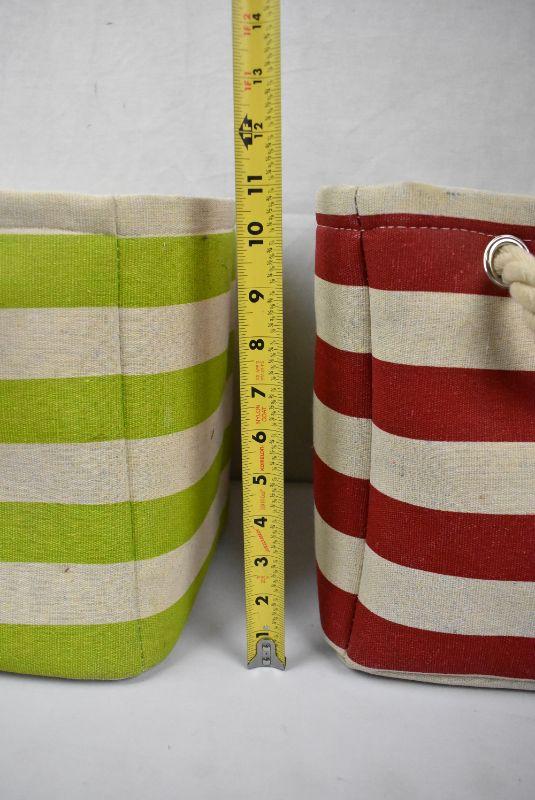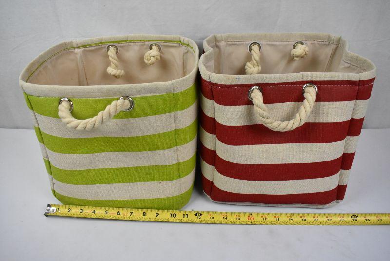 2 pc Canvas Bins: Tan/Green Stripes & Tan/Red Stripes, need cleaning