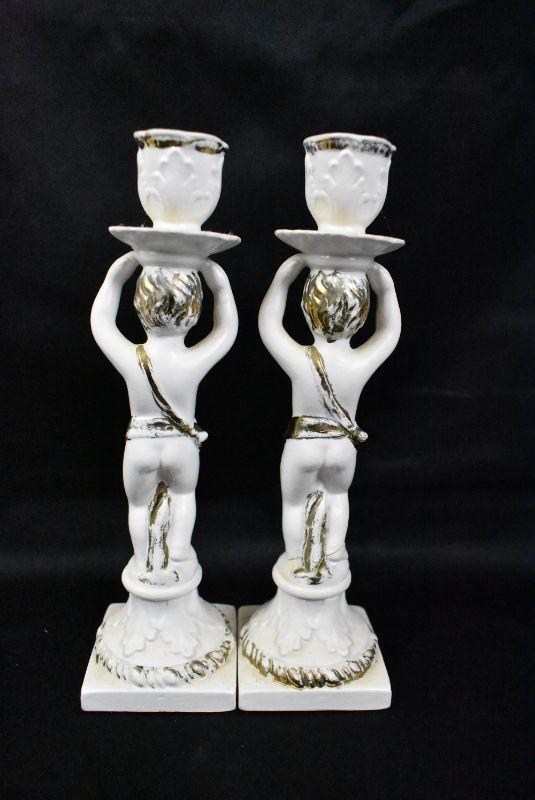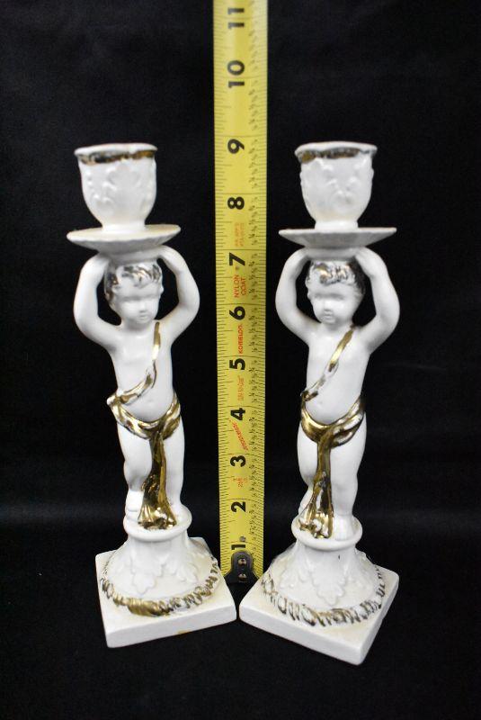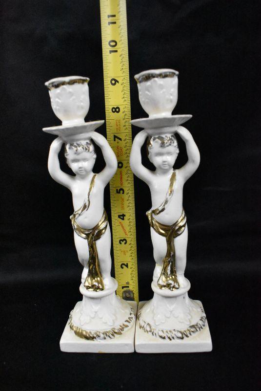 2 pc Cherub Candle Holders, Ceramic painted white & gold