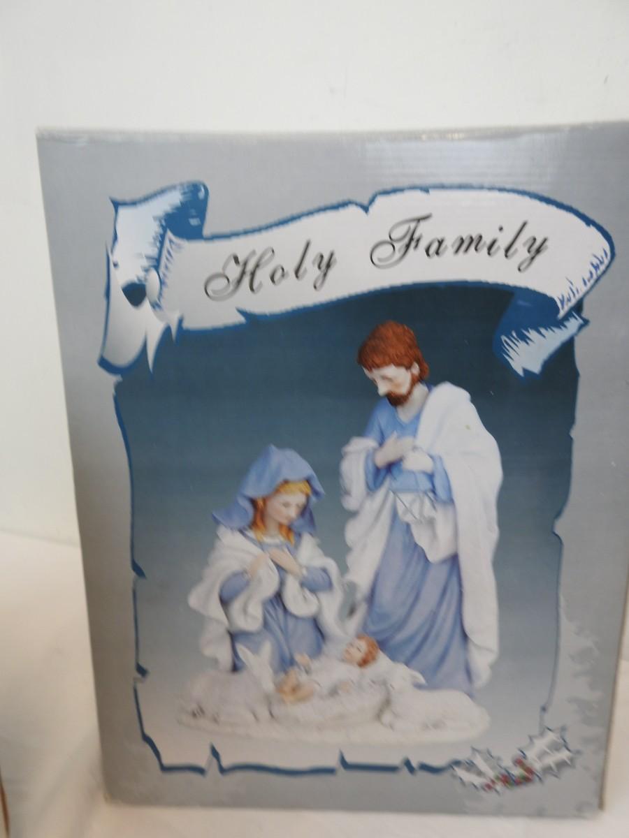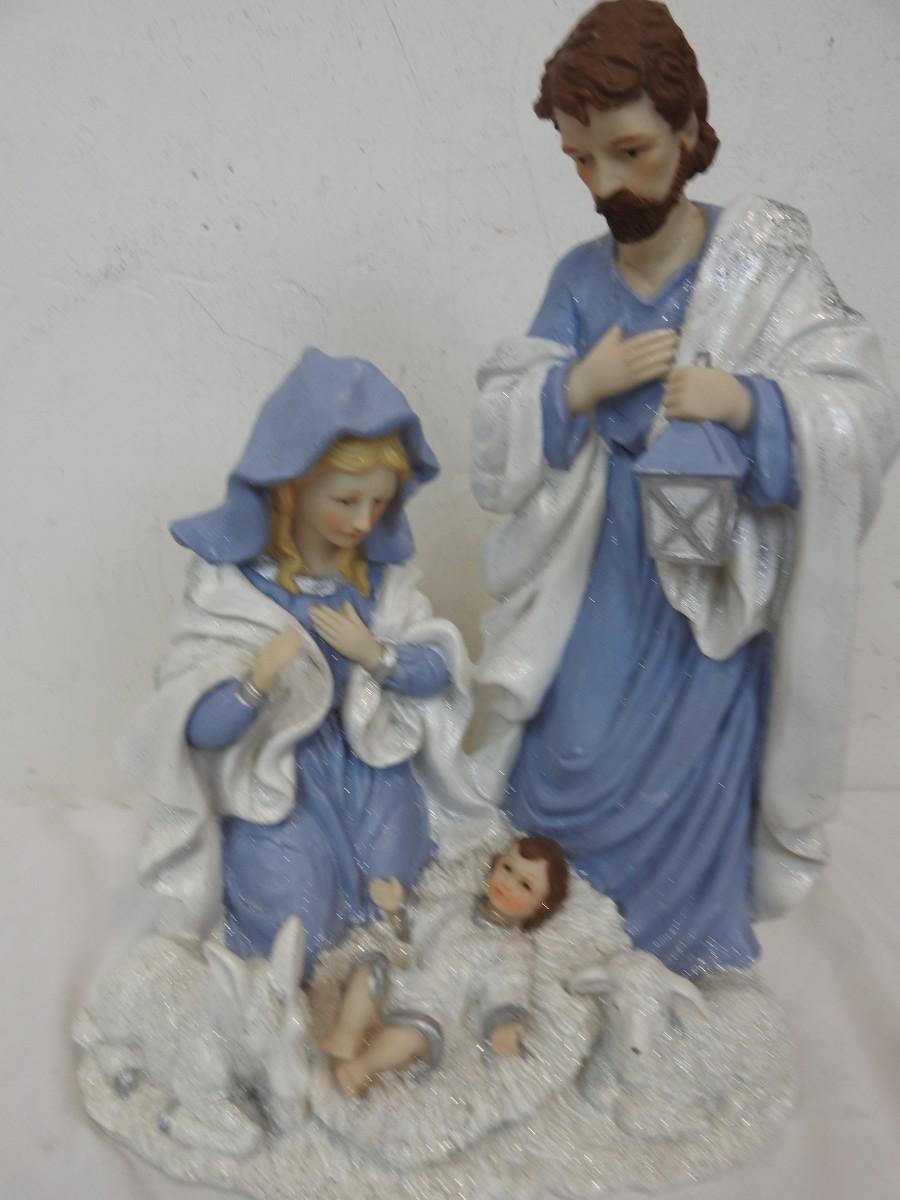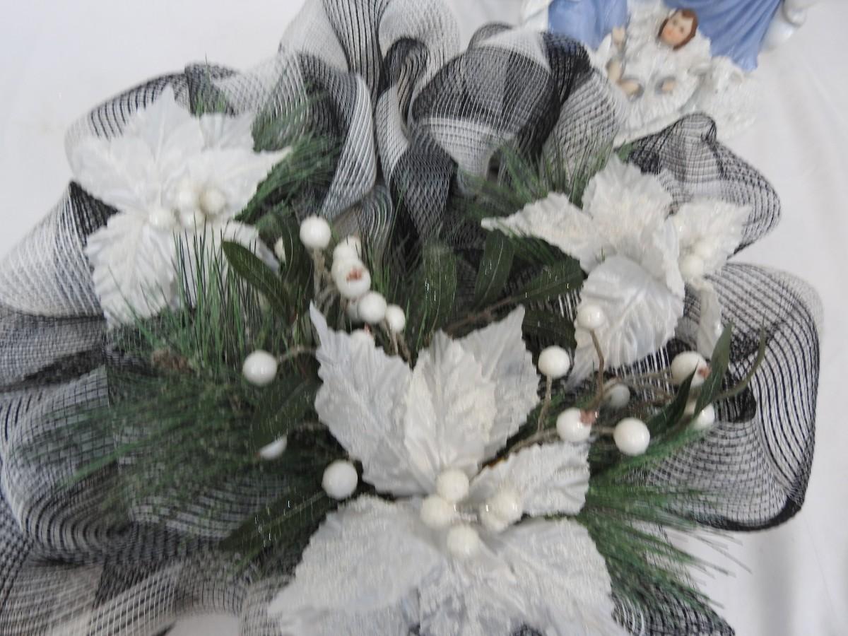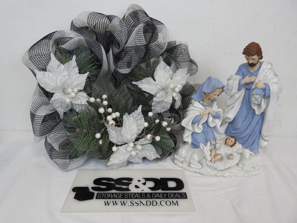 2 Pc Christmas Lot: 14in Blue/White/Silver Nativity Ceramic Statue,Joseph's Head Has been Mended, & Has Small Chip 20in Mesh Wreath W/Flowers