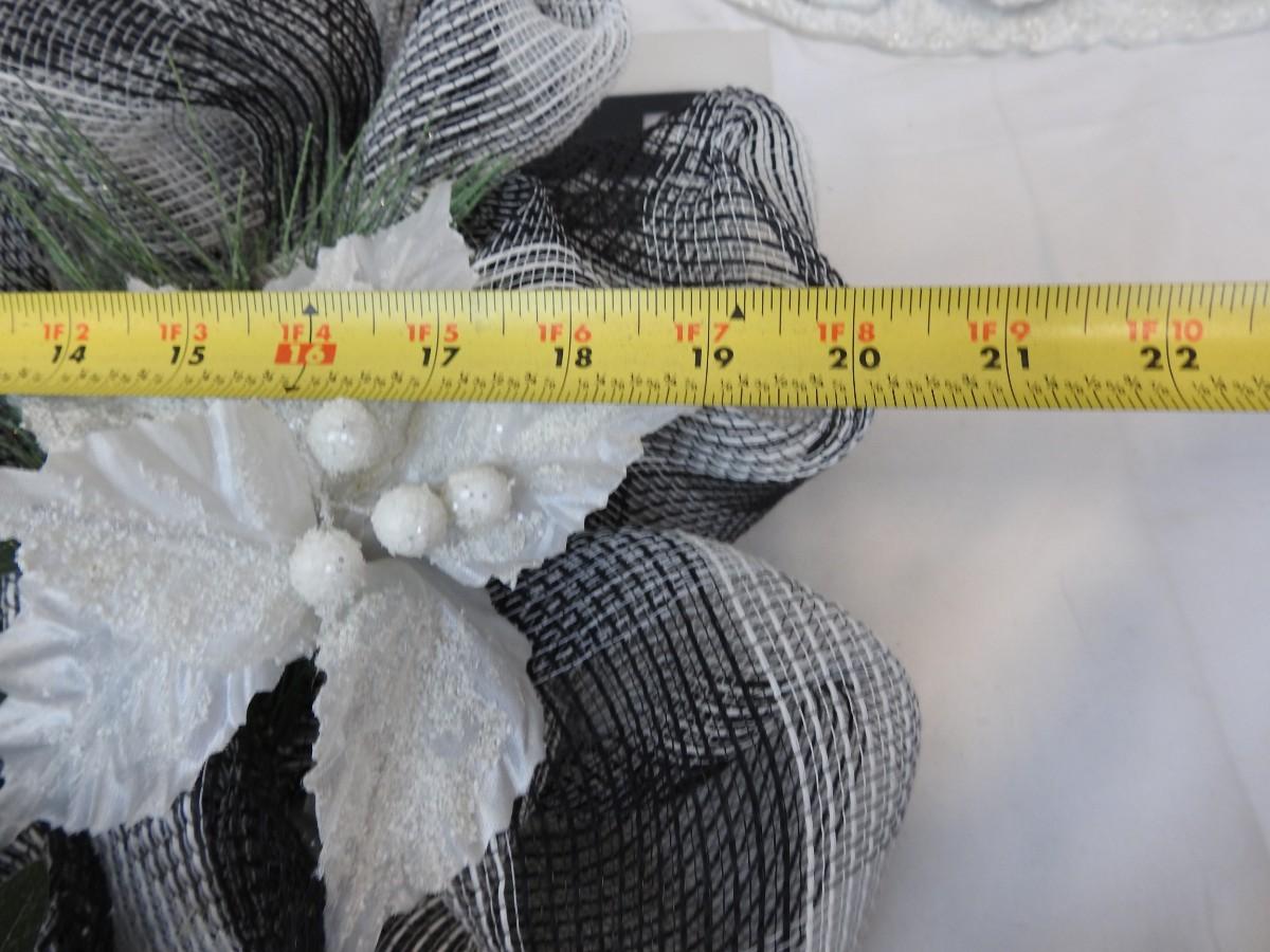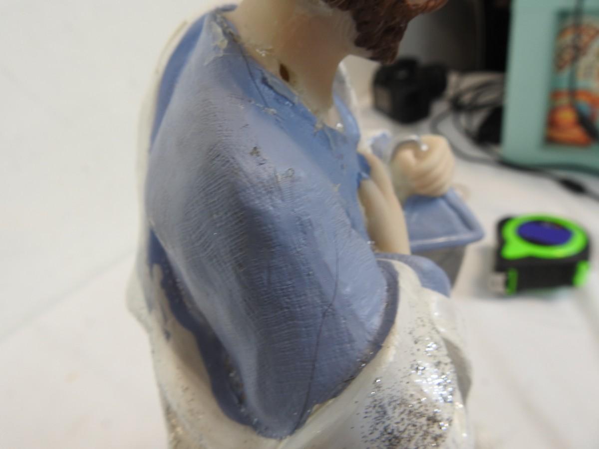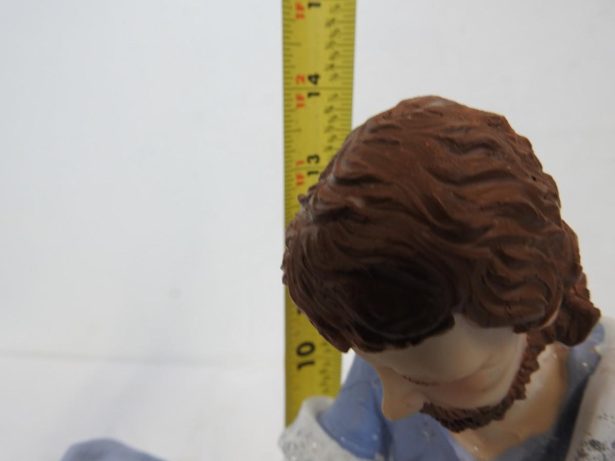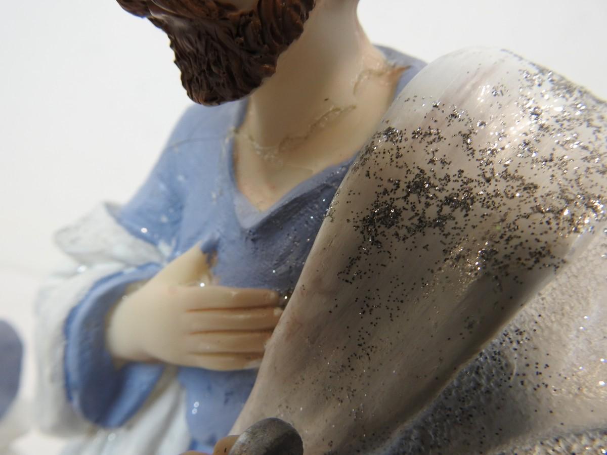 2 Pc Christmas Lot: 14in Blue/White/Silver Nativity Ceramic Statue,Joseph's Head Has been Mended, & Has Small Chip 20in Mesh Wreath W/Flowers