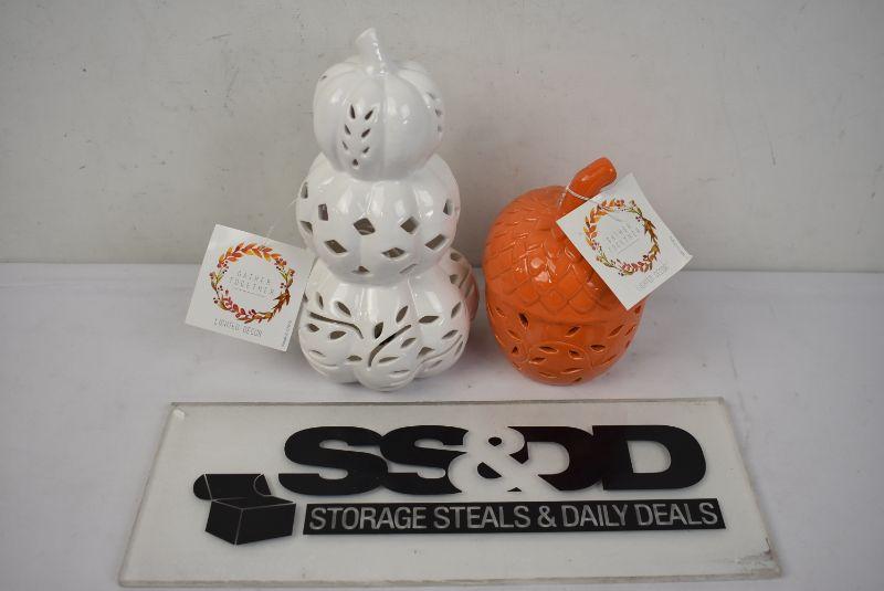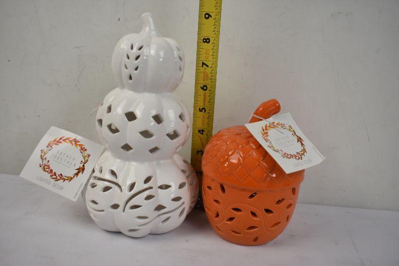2 pc Gather Together Lighted Decor. White Pumpkins & Orange Acorn - New