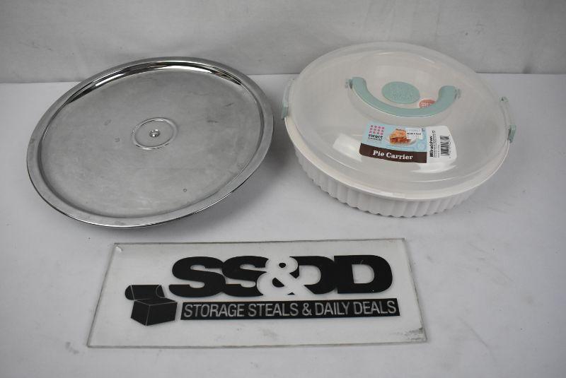 2 pc Kitchen: Plastic Carrier for Pies, & Metal Serving Tray Stand
