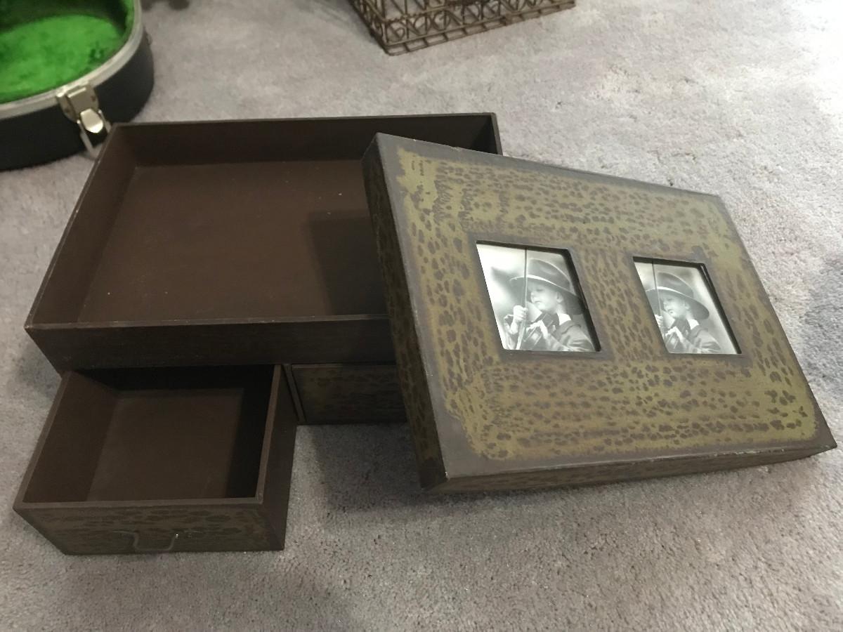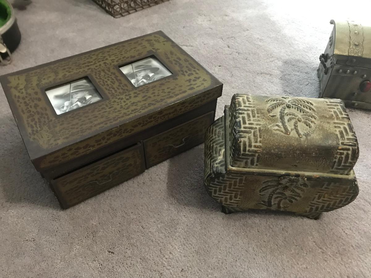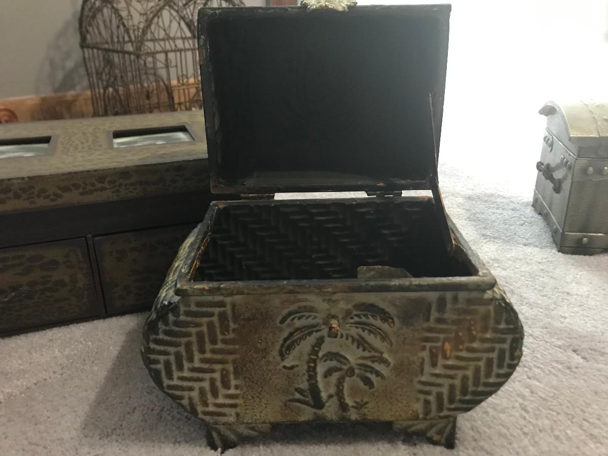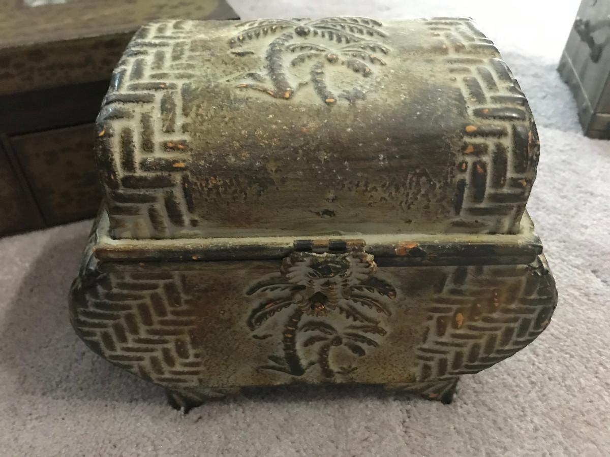 KIRKLANDS MEMORY STORAGE BOX: 11.5"W X 8"D X 5.5"H; DECO MINI CHEST WITH. PALMTREES: 8.5" X 4.5" X 7"
