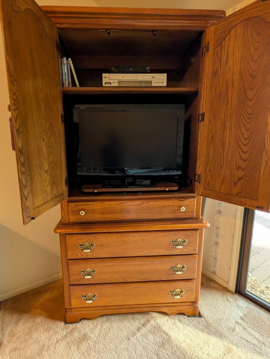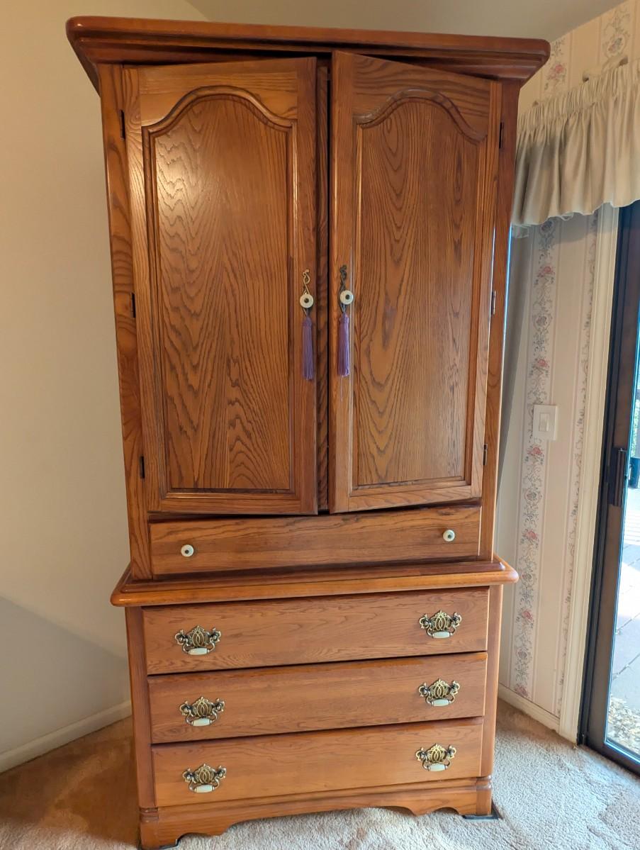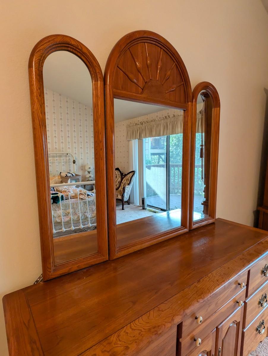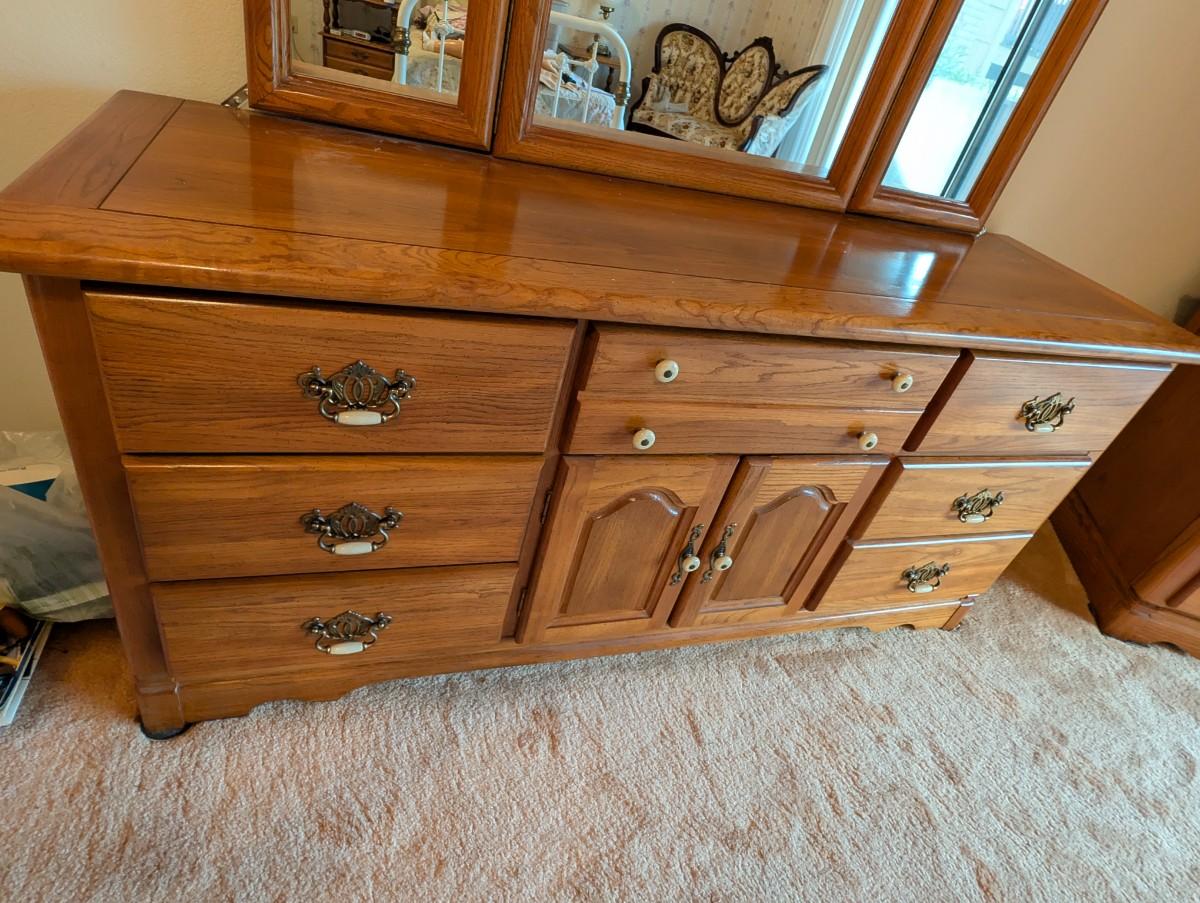 2 pc set Broyhill Furniture 9 drawer Oak Dresser w/ Tri Fold Mirror and Matching Oak Armoire