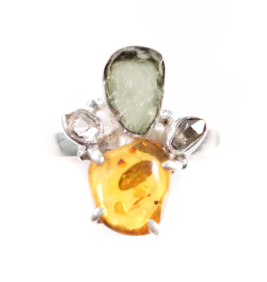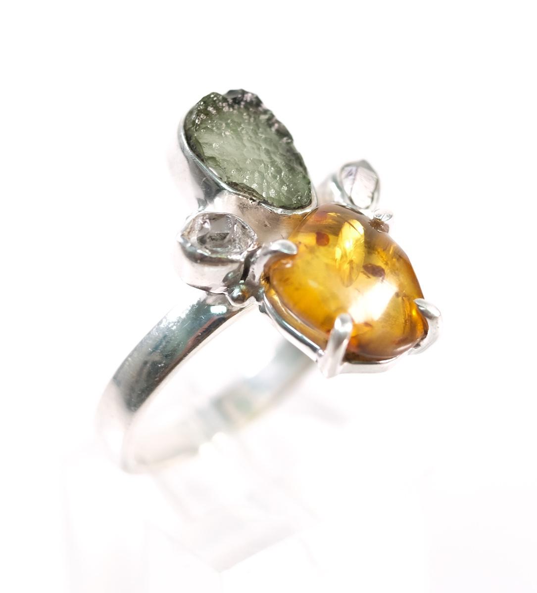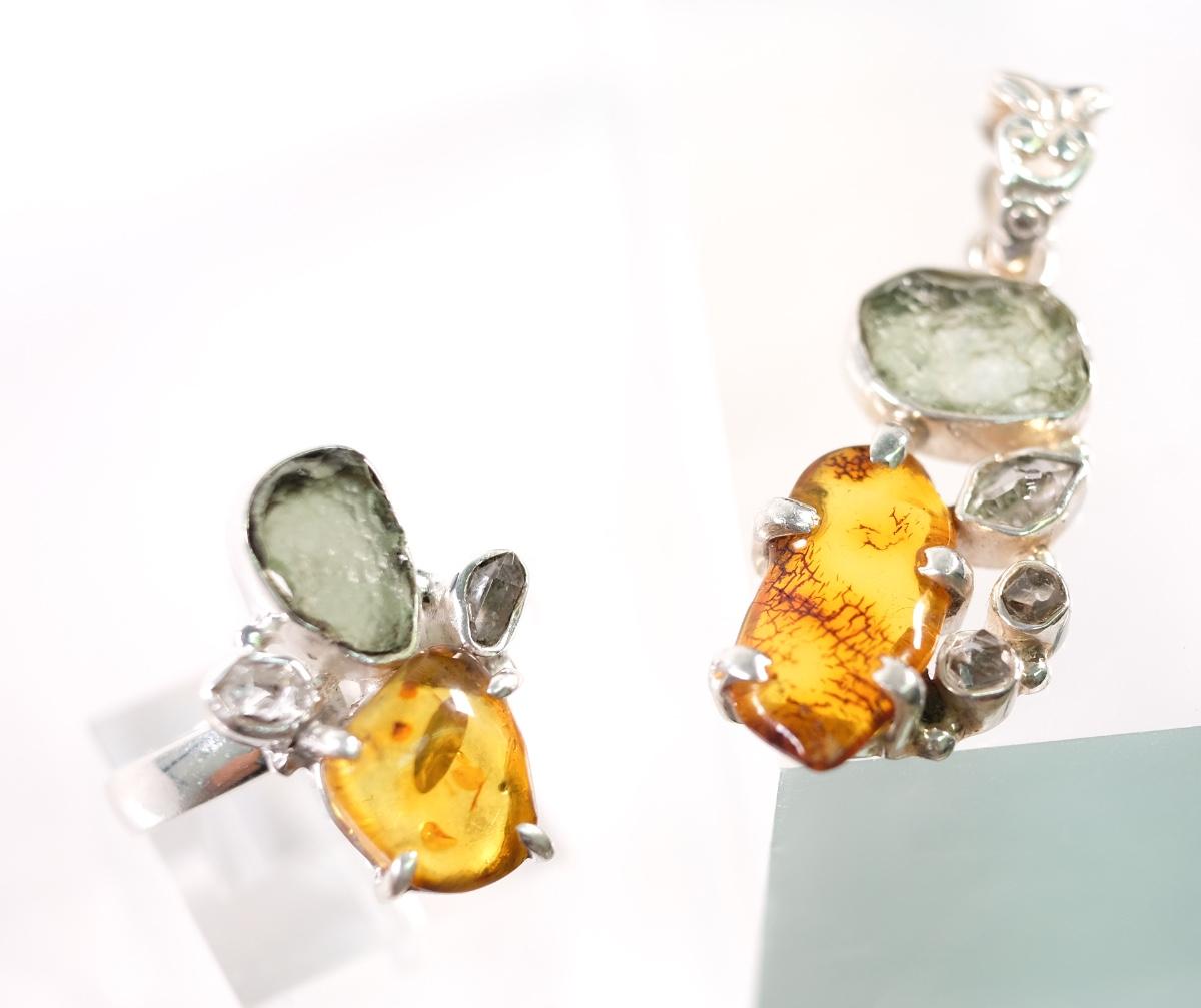 2 PC Sterling Amber & Moldavite Pendant & Ring, Size 9.5