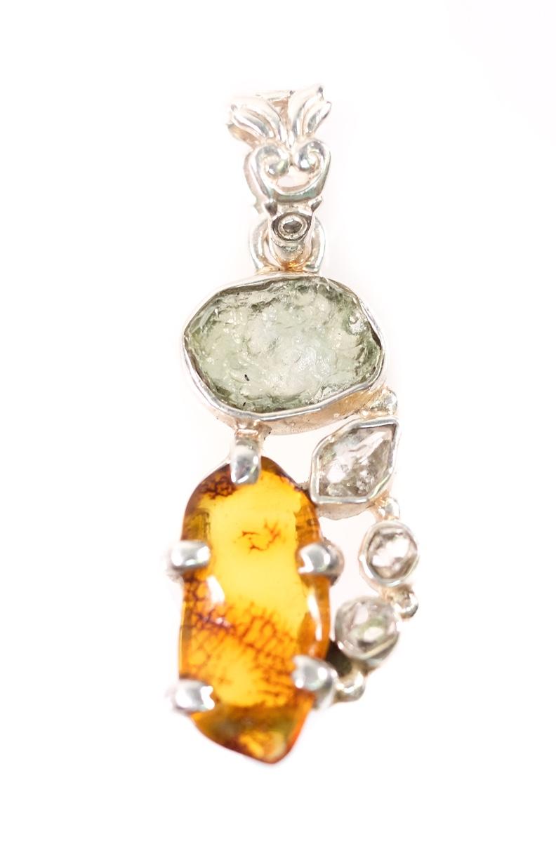 2 PC Sterling Amber & Moldavite Pendant & Ring. Ring size 9.5, stamped 925, weighs approx. 5 grams. Pendant stamped 925, measures approx. 1.5", weighs approx. 4.2 grams.