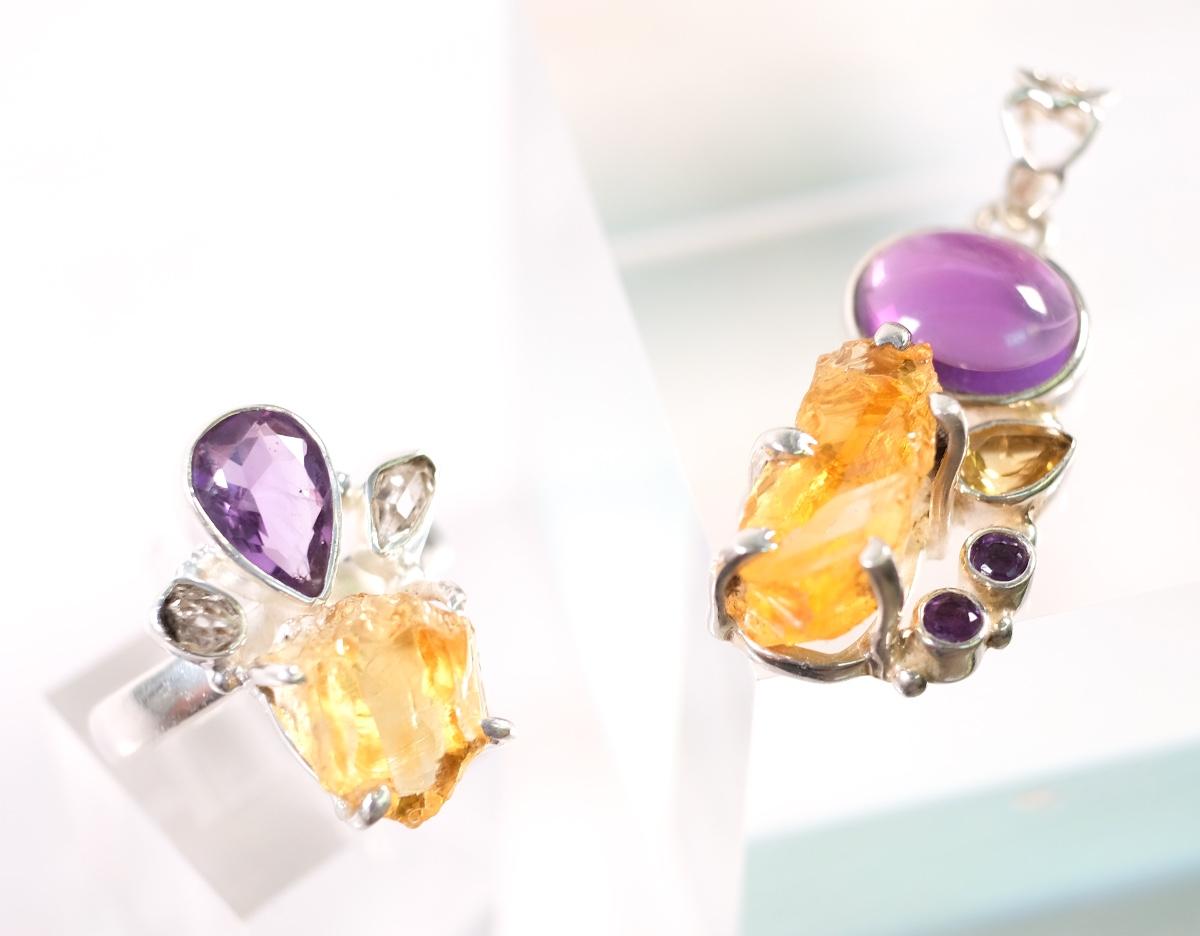 2 PC Sterling Citrine & Amethyst Pendant & Ring, Size 8.25