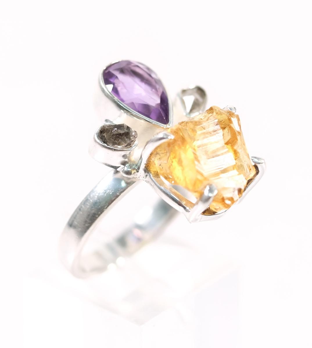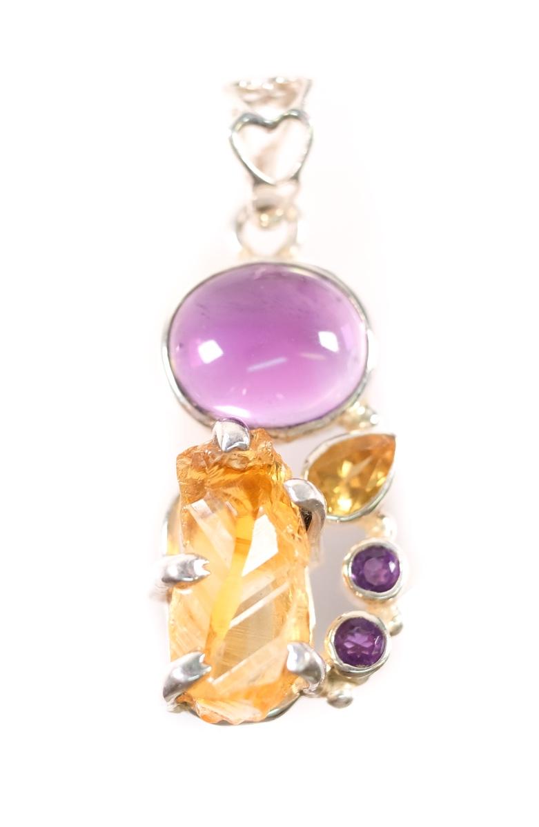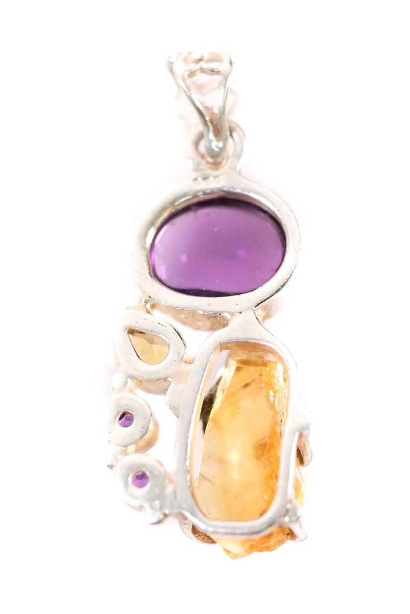 2 PC Sterling Citrine & Amethyst Pendant & Ring. Ring size 8.25, stamped 925, weighs approx. 6 grams. Pendant stamped 925, measures approx. 1.5", weighs approx. 6 grams.