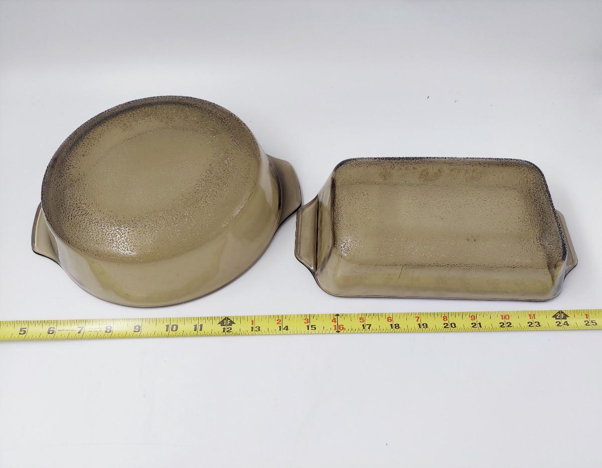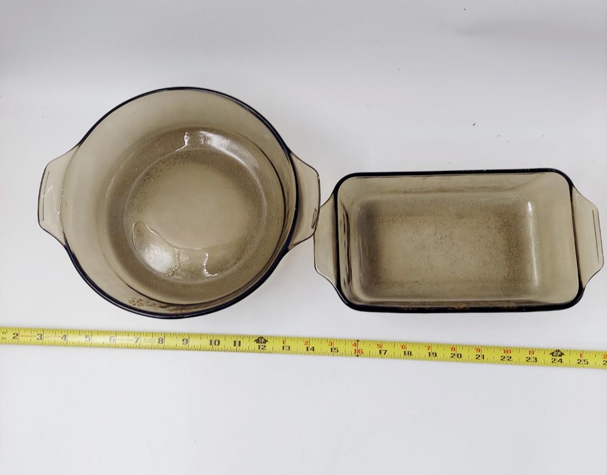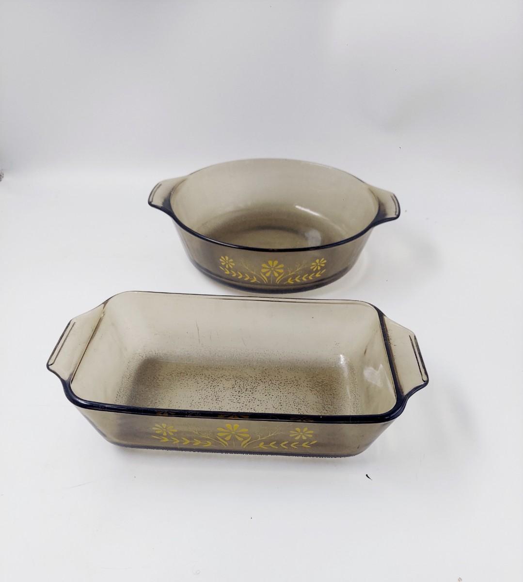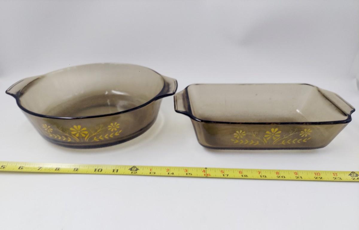 2 pc VINTAGE GLASBAKE BROWN GLASS BAKING DISH W/ GOLD DAISY FLOWERS