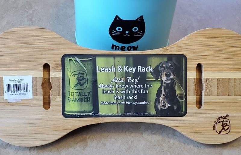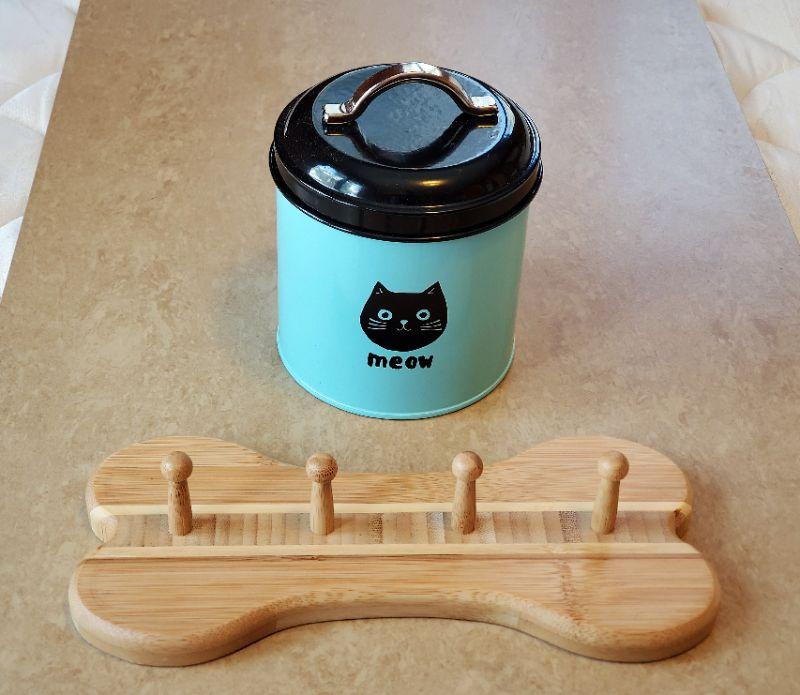 Bamboo Bone Shaped Leash Rack and Teal Kitten Treat Jar (Rack: 4"x9 1/2" Jar: 5"x4")