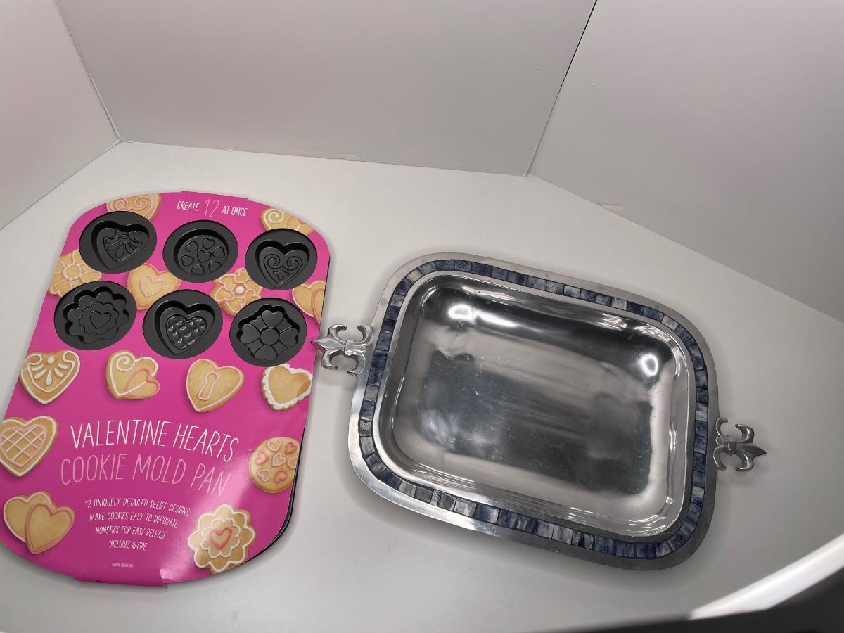 Fleur de Le serving tray with inlaid stone silver metal tray enhanced by fleur de lee that act has handles
