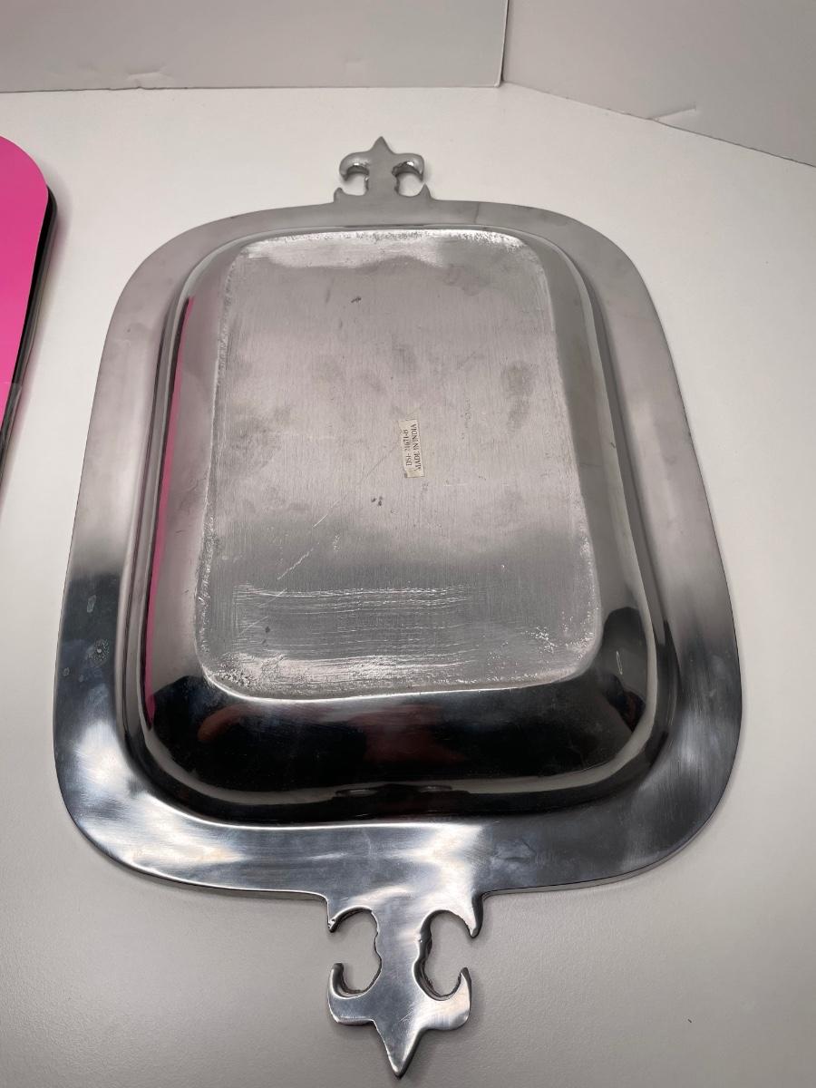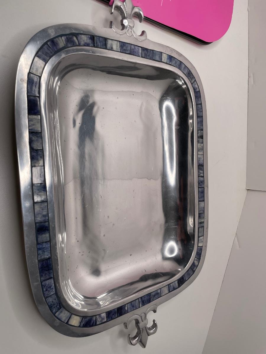 Fleur de Le serving tray with inlaid stone silver metal tray enhanced by fleur de lee that act has handles