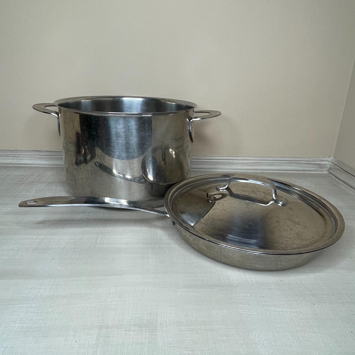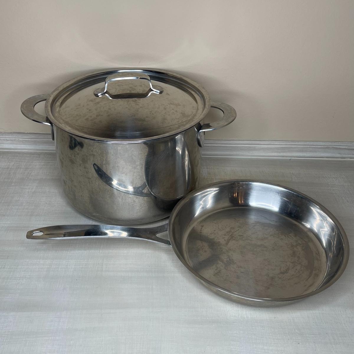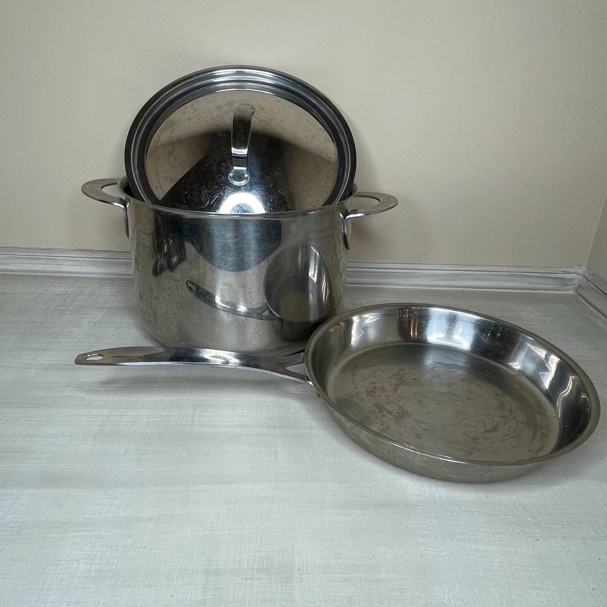 10” skillet and 9-1/2qt stock pot. Lid fits both pieces.