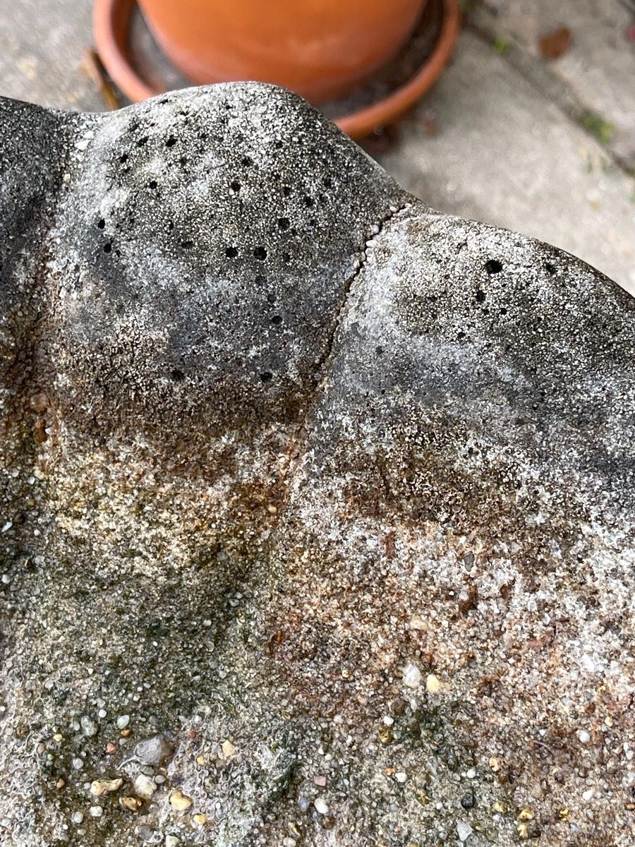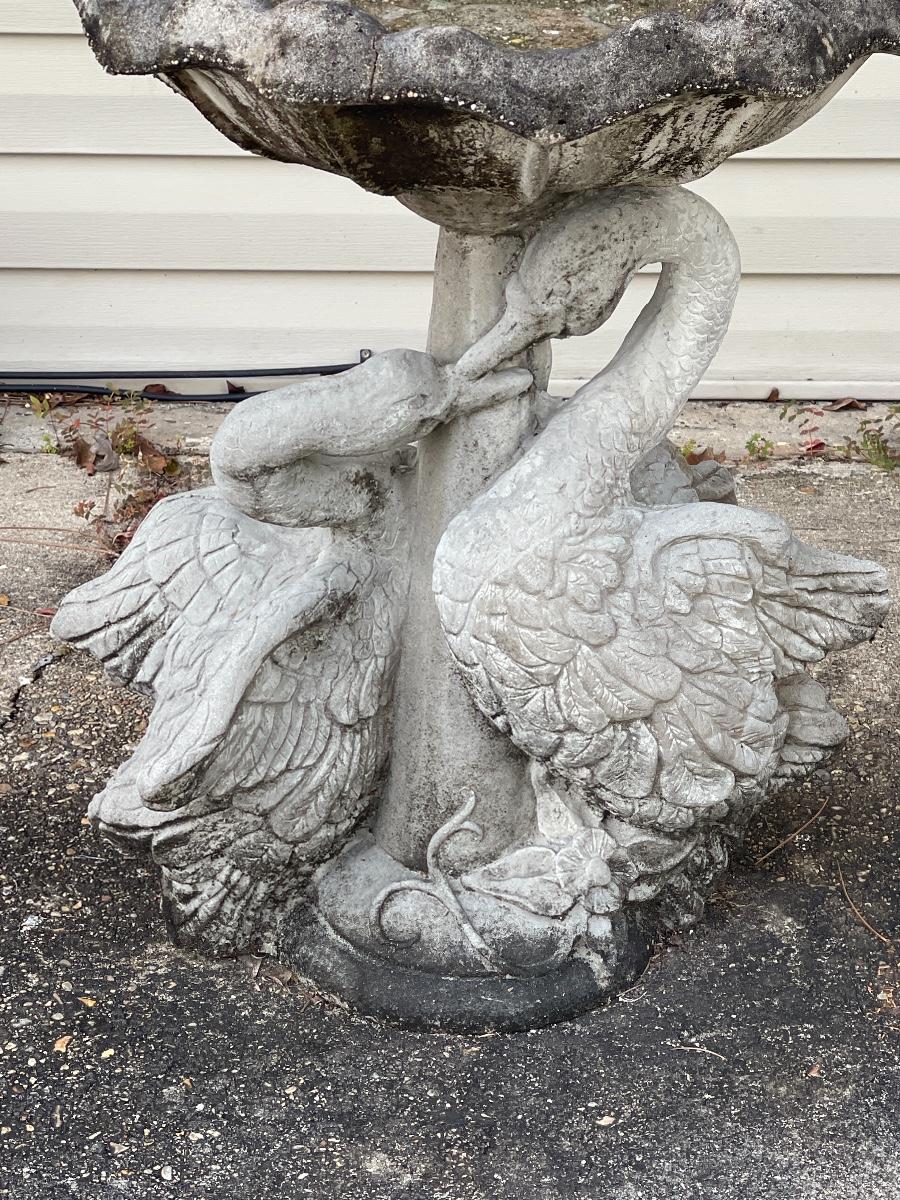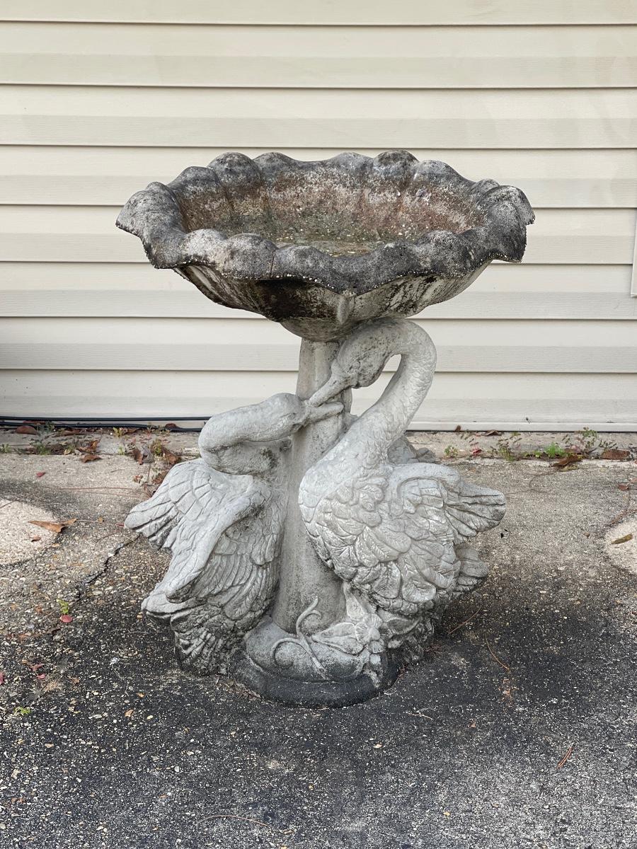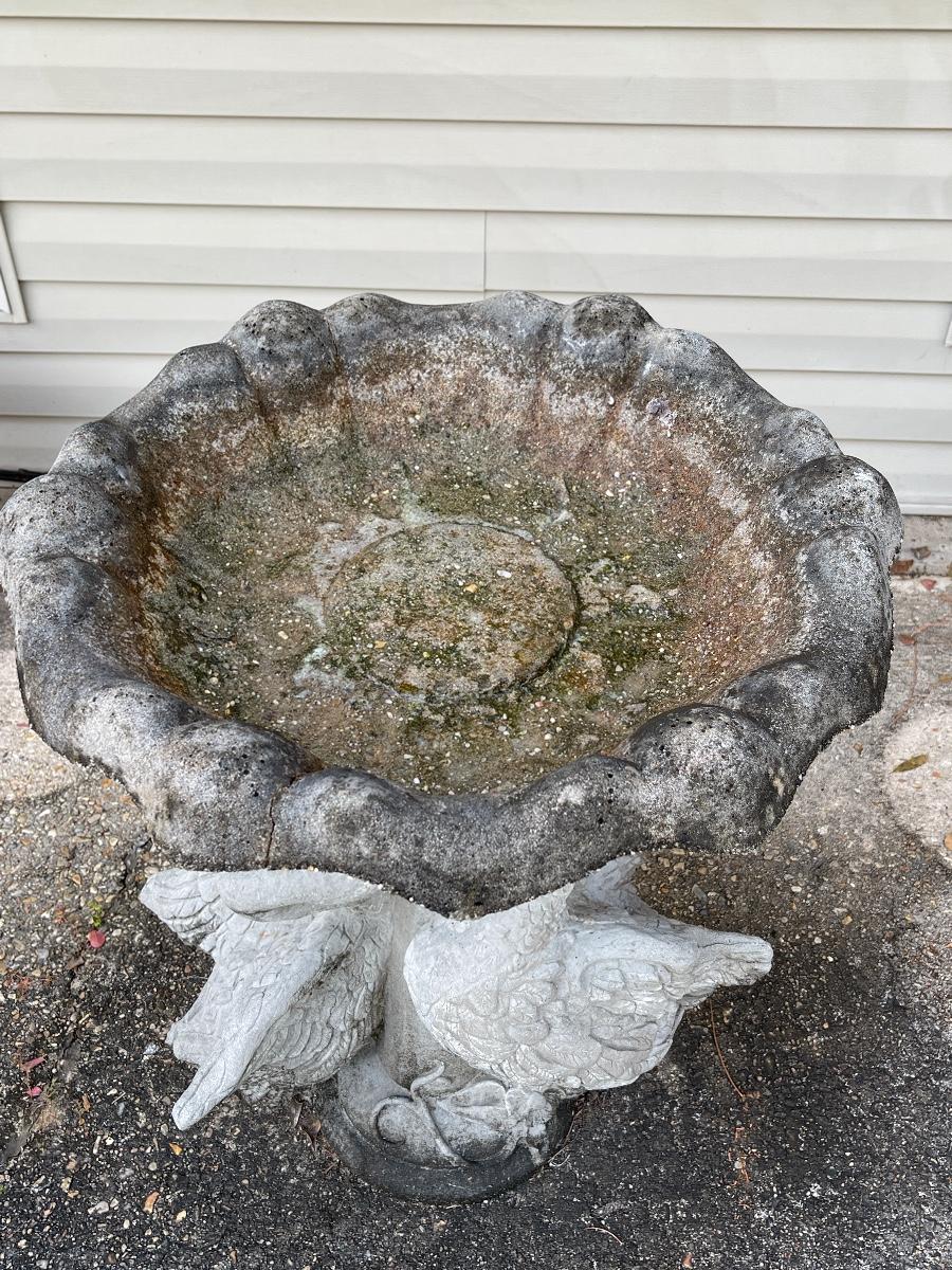 29 1/2” H x 24” Round, Comes in 2 pieces. Minor cracks in bath on side. Stills hold water or bird seed. Heavy