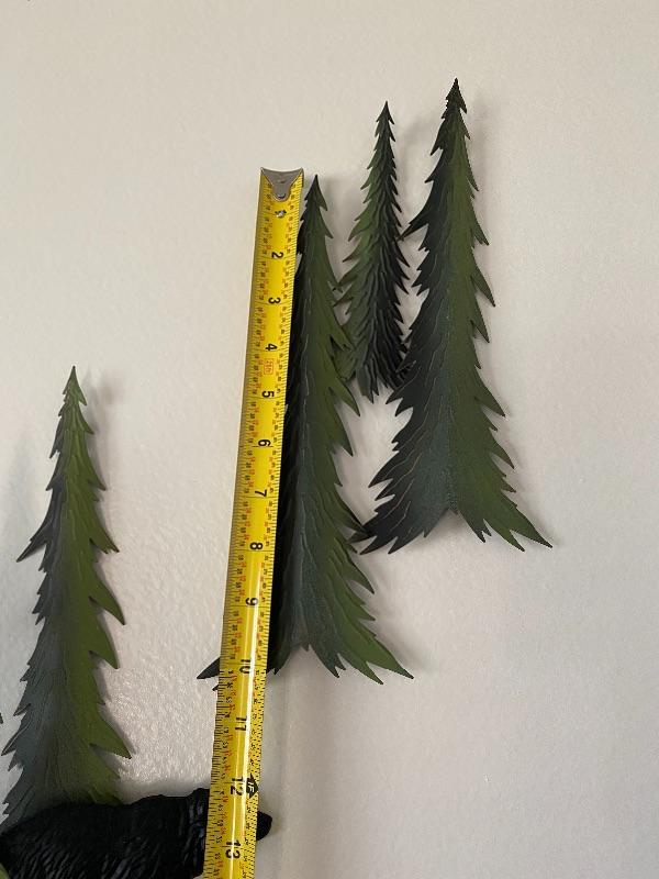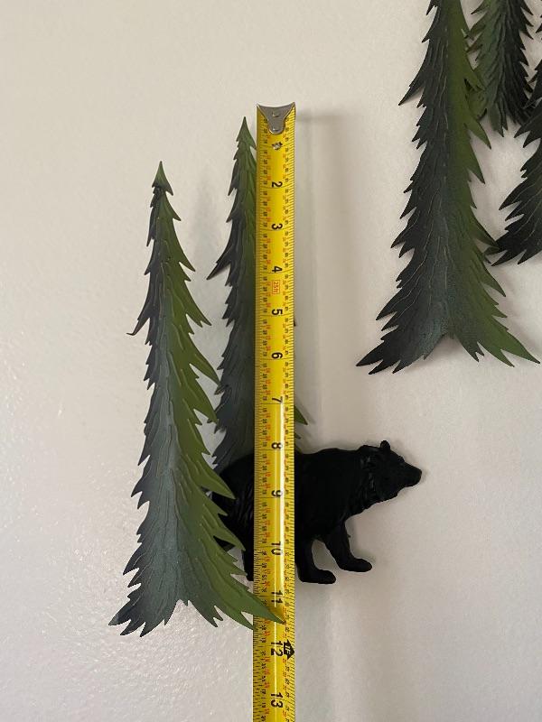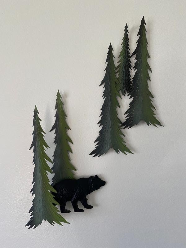 Cute rustic metal wall art. Pine trees and a bear. About 10" in size.