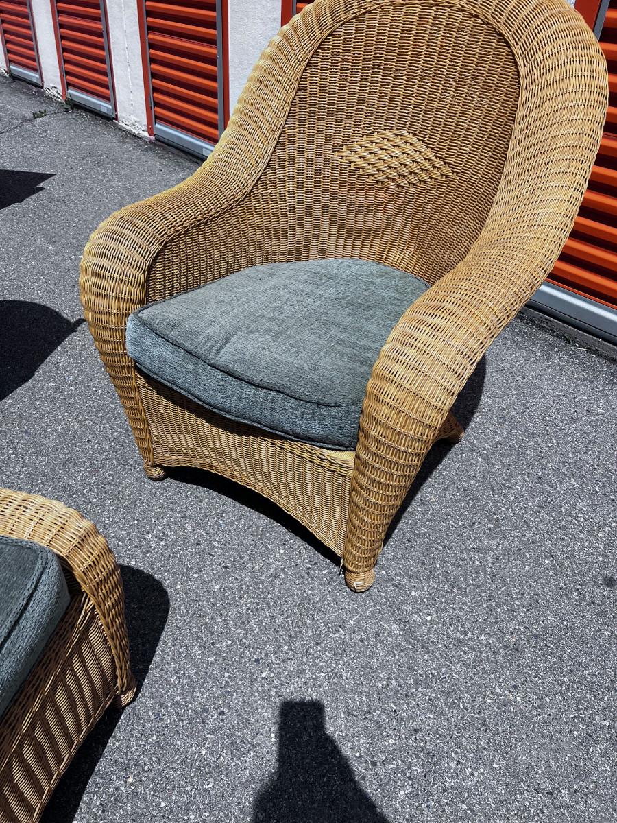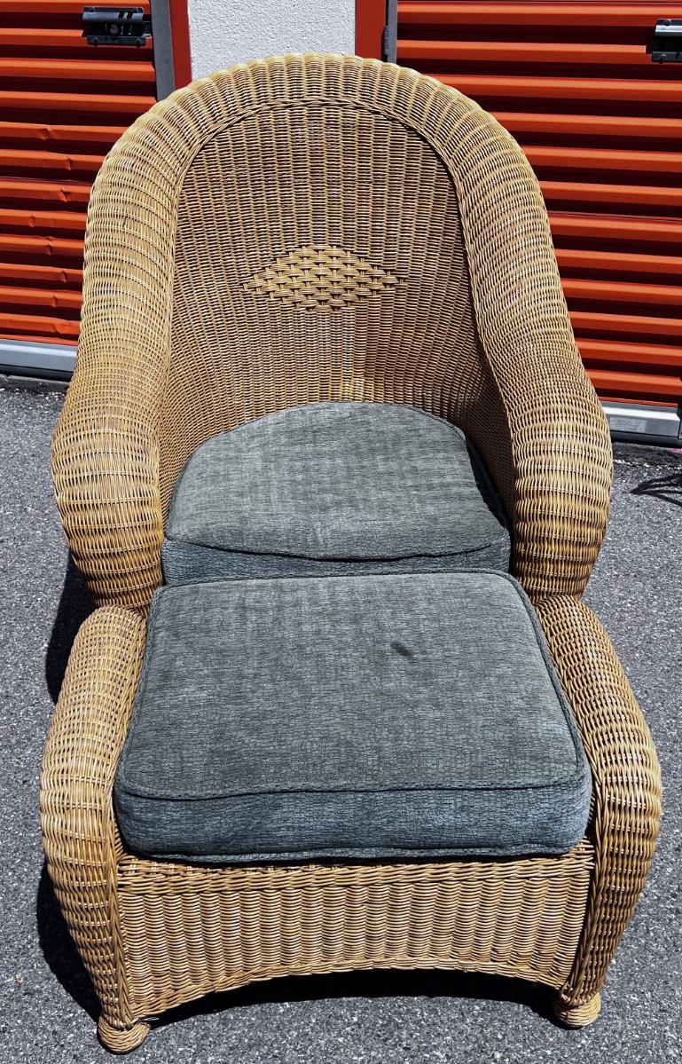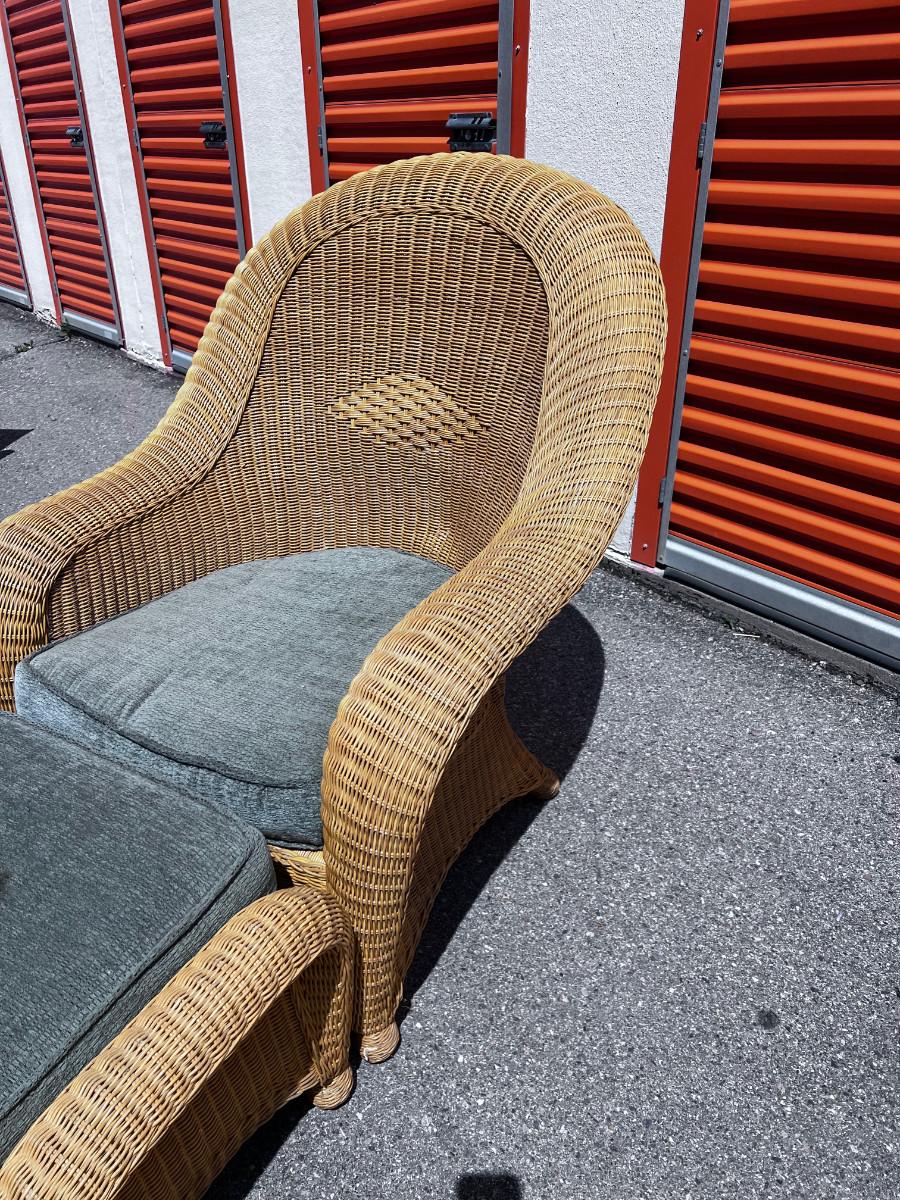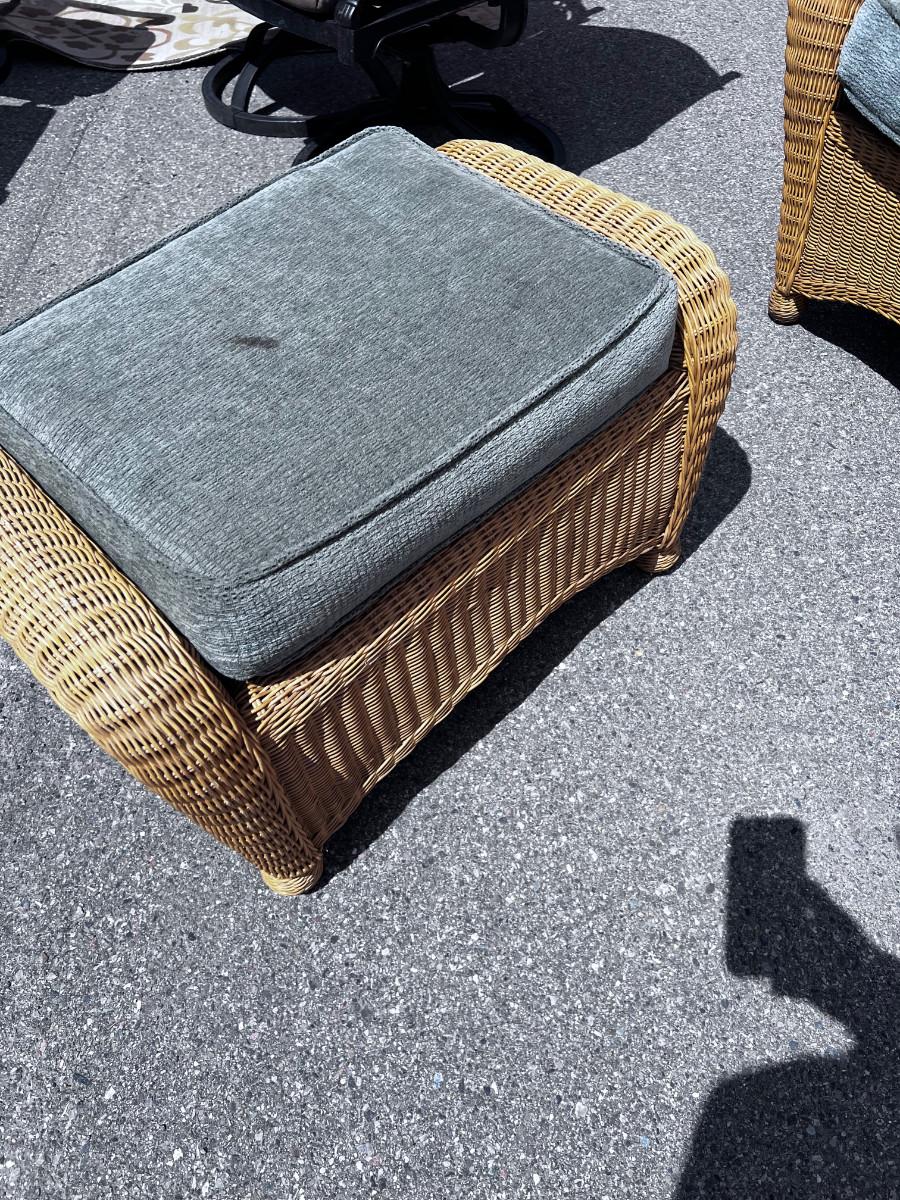 2 Piece Wicker Chair with Ottoman and Light Green Cushions