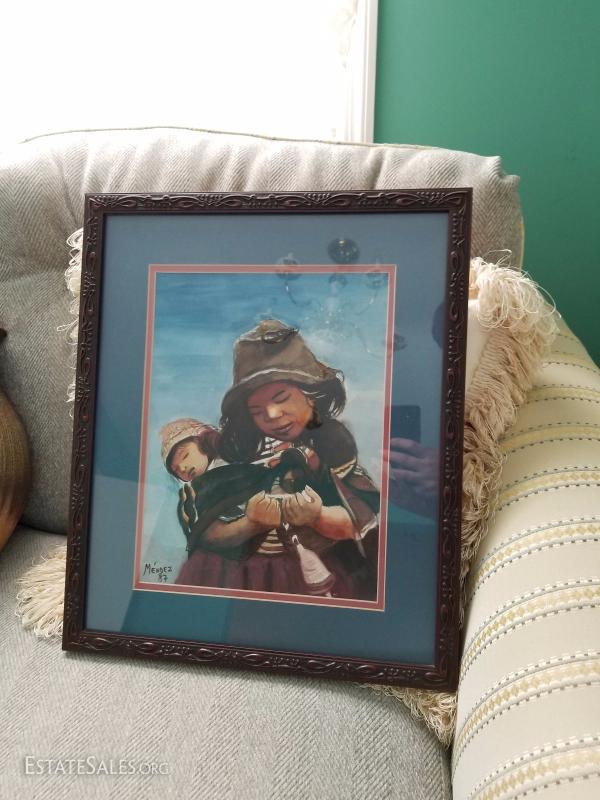 mother with child signed Mendez '87 and triple matted framed mother with child walking on street
