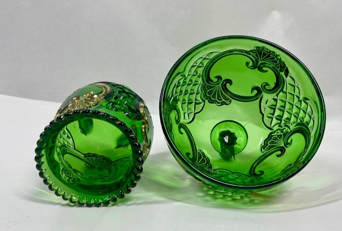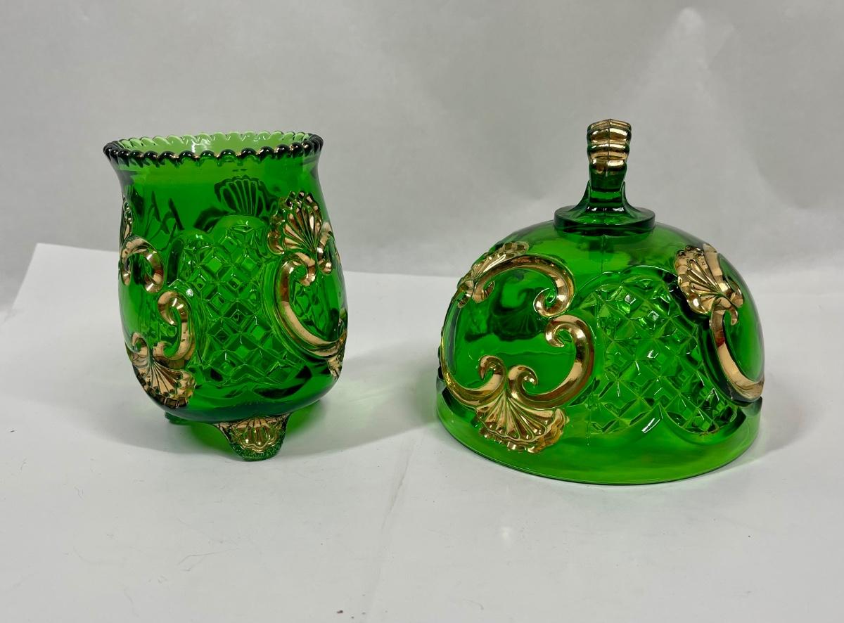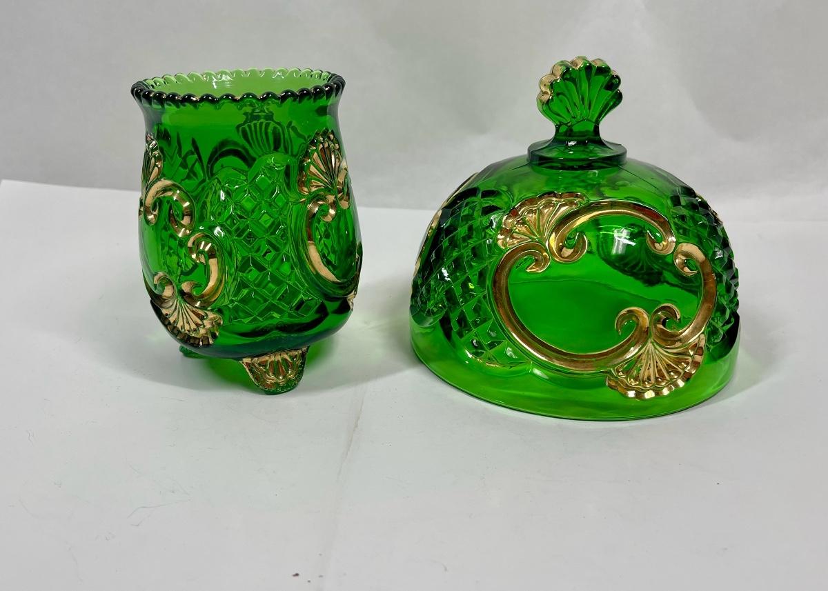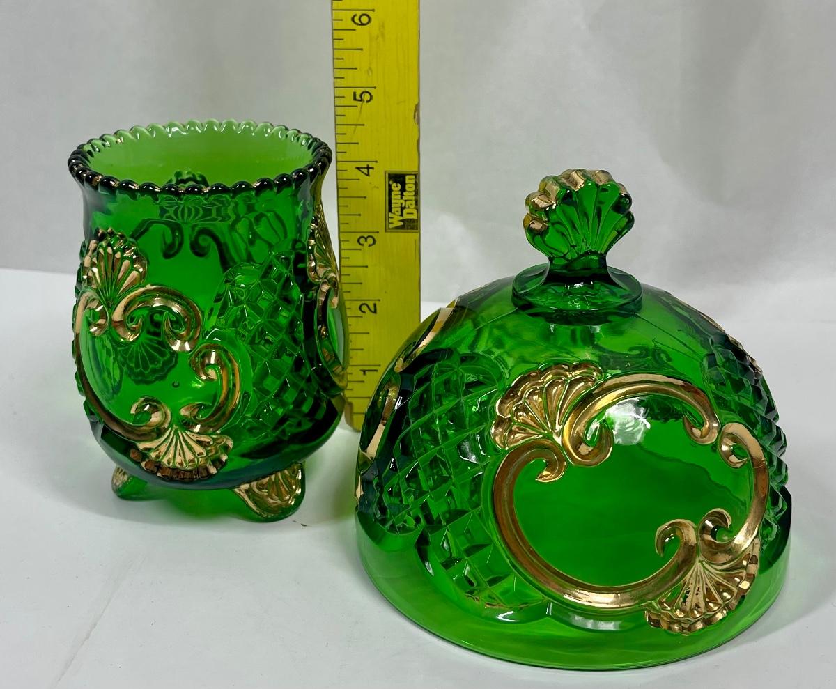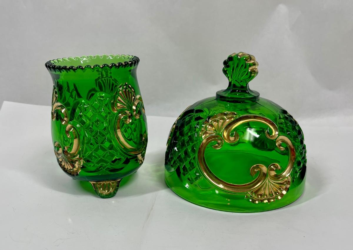 2 pieces of McKee Riverside Glass Croesus Green & Gold butter dish (top only) & Footed Spooner