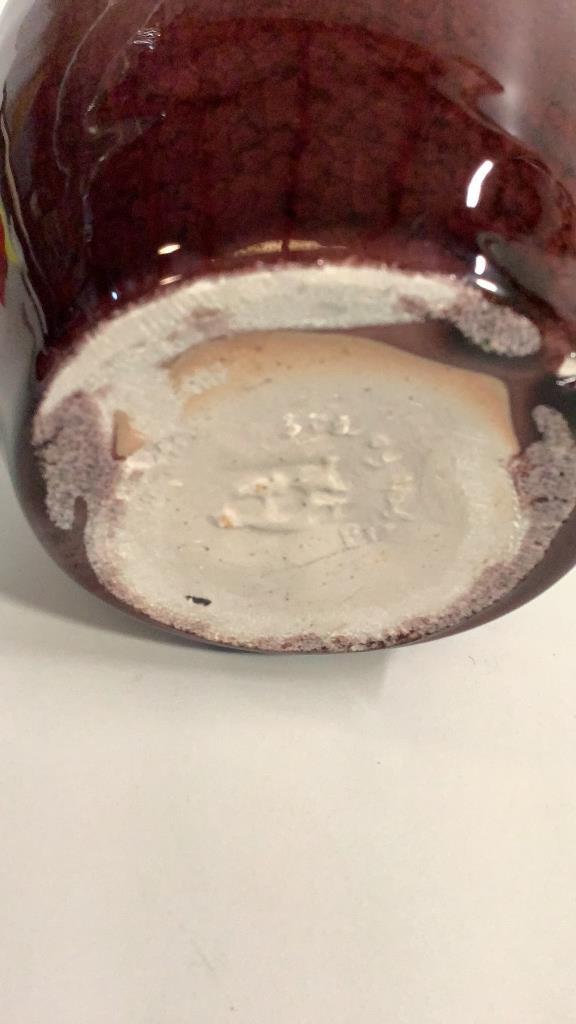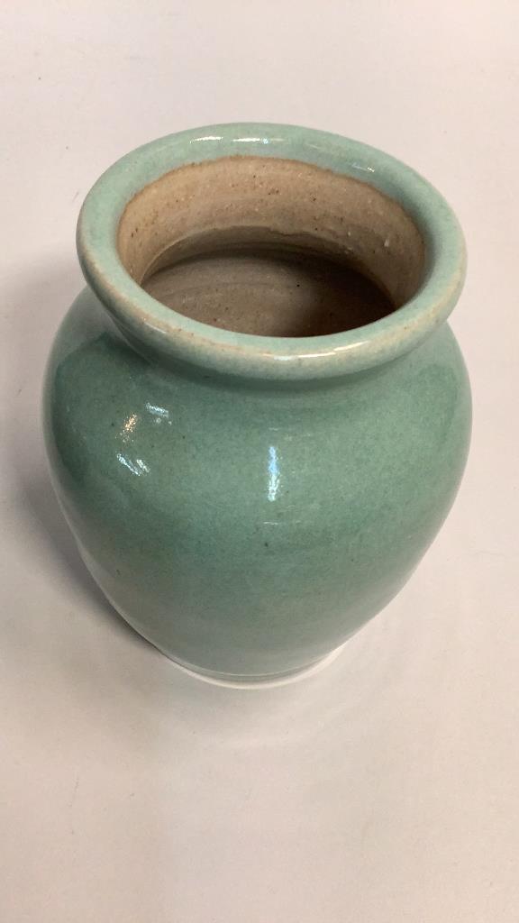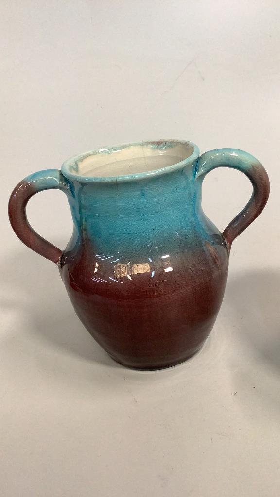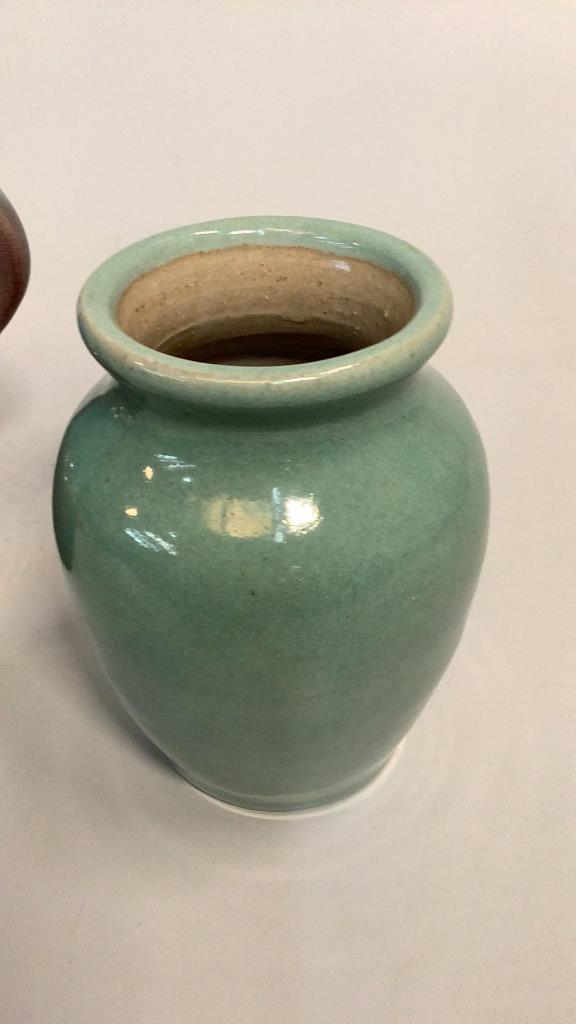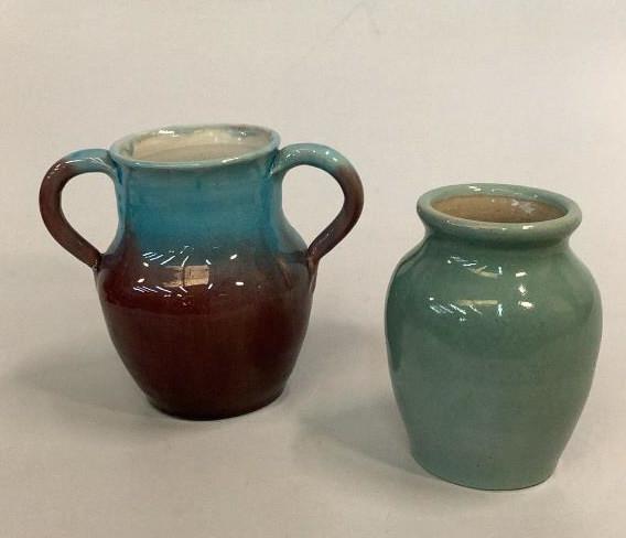 7 inch double handle vase..teal and aubergine glaze..no date, 6 inch vase in green glazeÂ…faint stamped..no dateÂ…* hairline at rim of larger vase