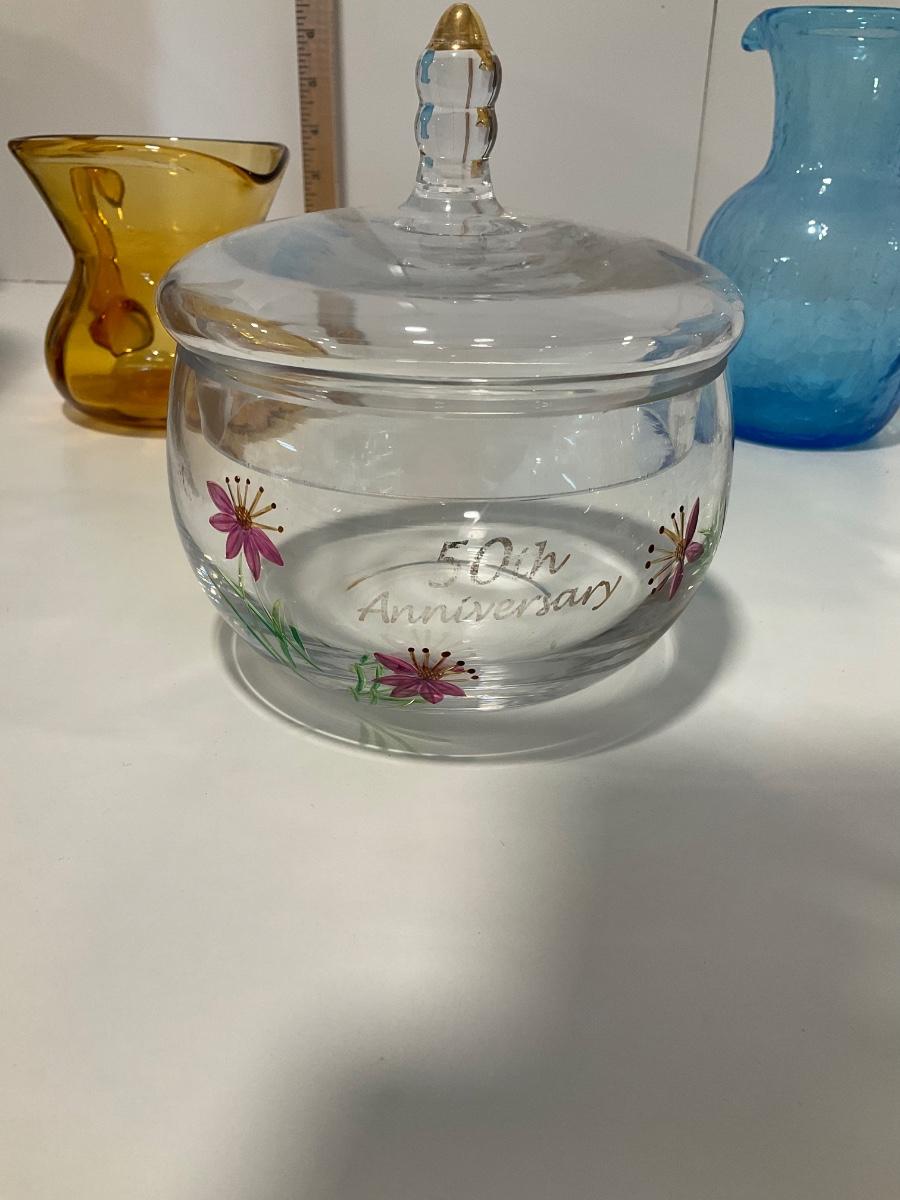 50th Anniversary Dish with lid has flowers on front