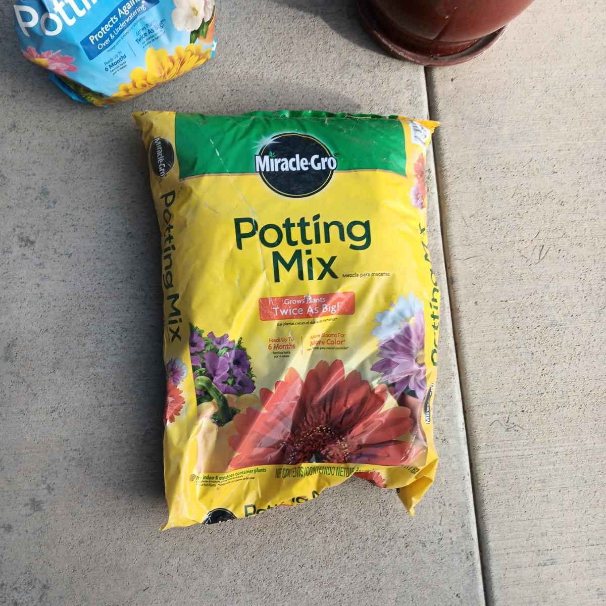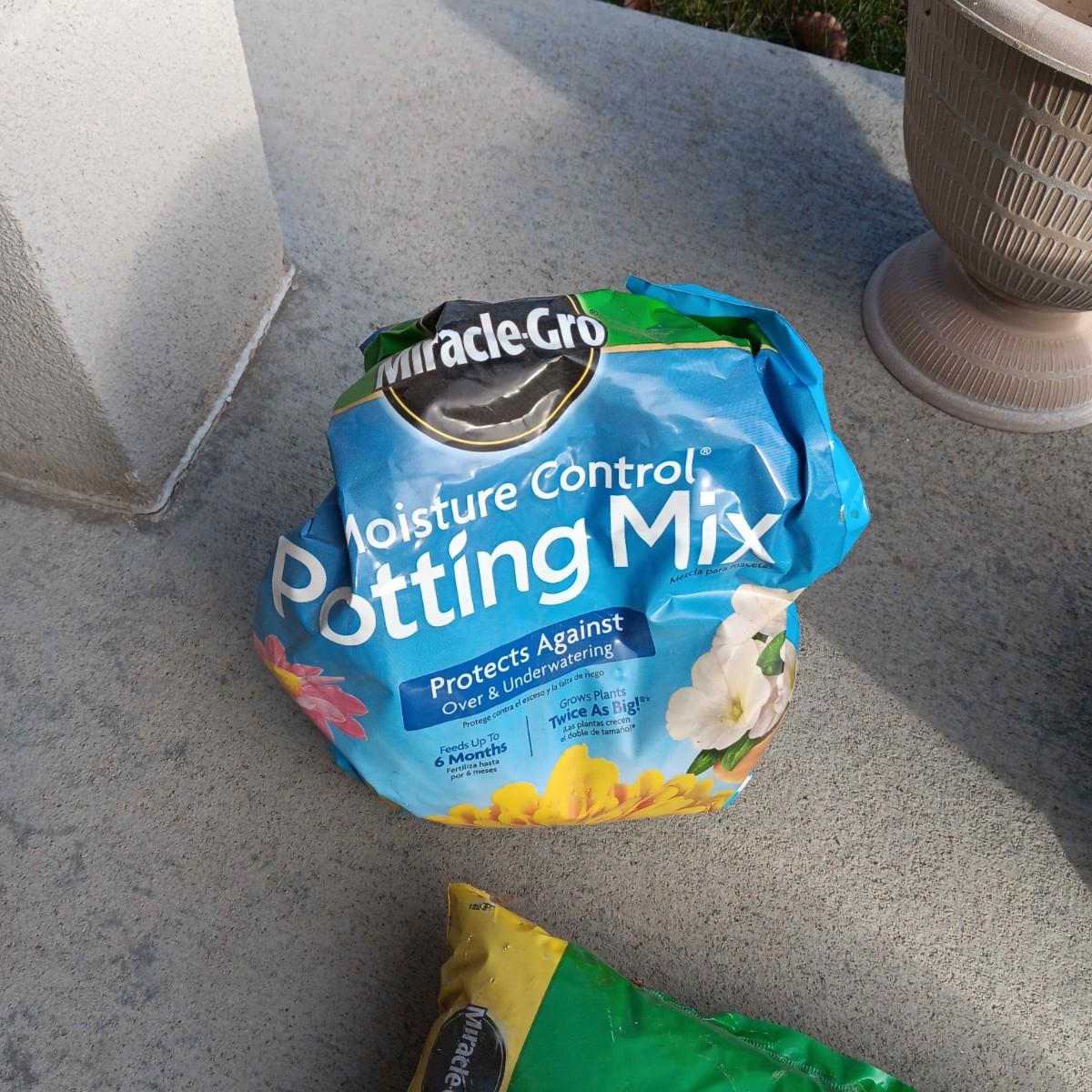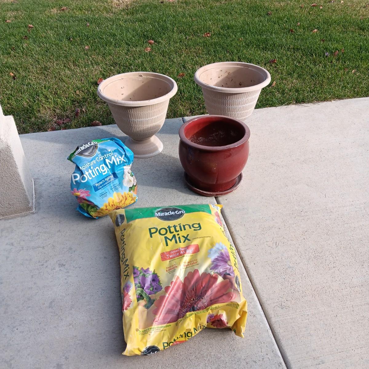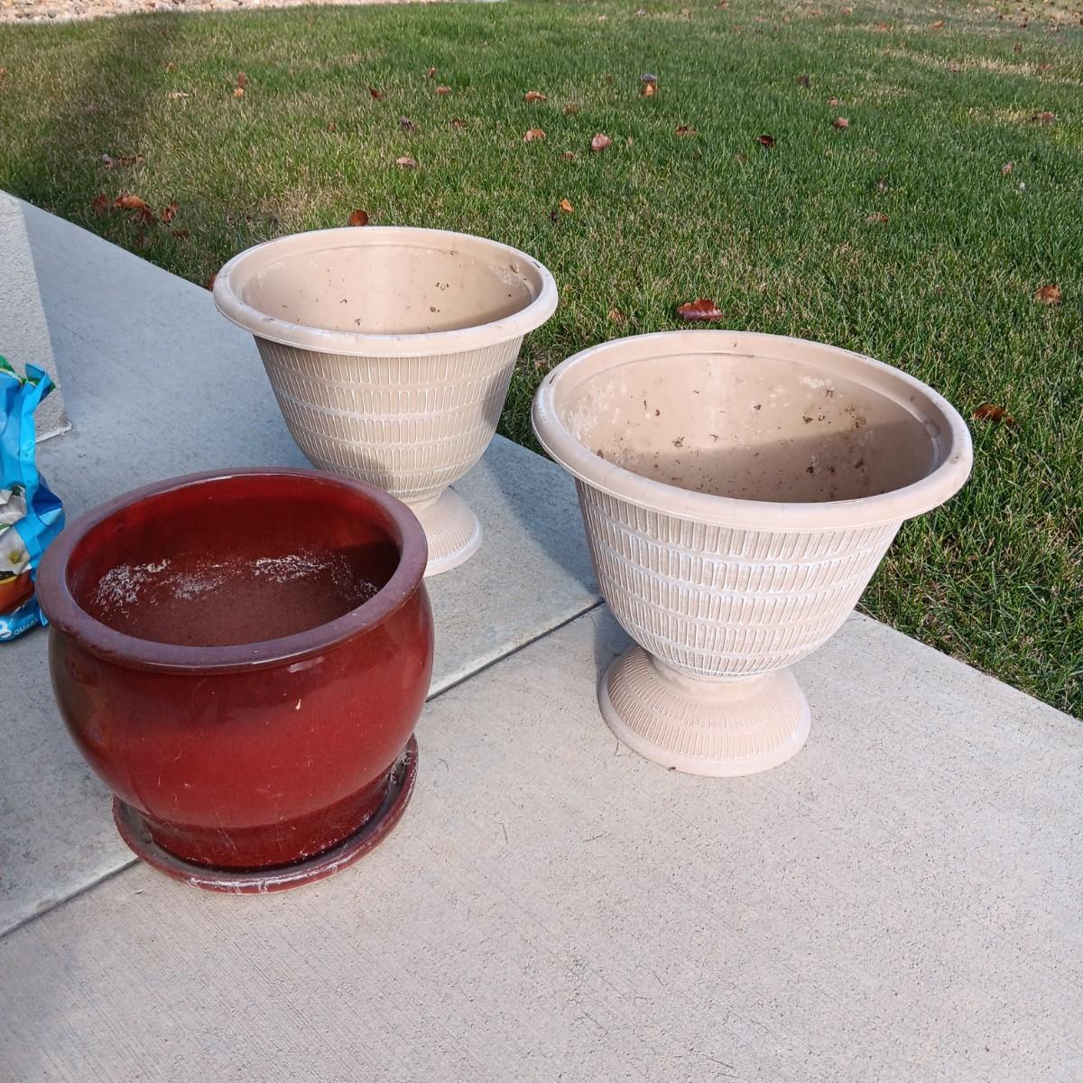 2 PLASTIC AND 1 CLAY FLOWER POTS PLUS BAG OF POTTING SOIL MIX