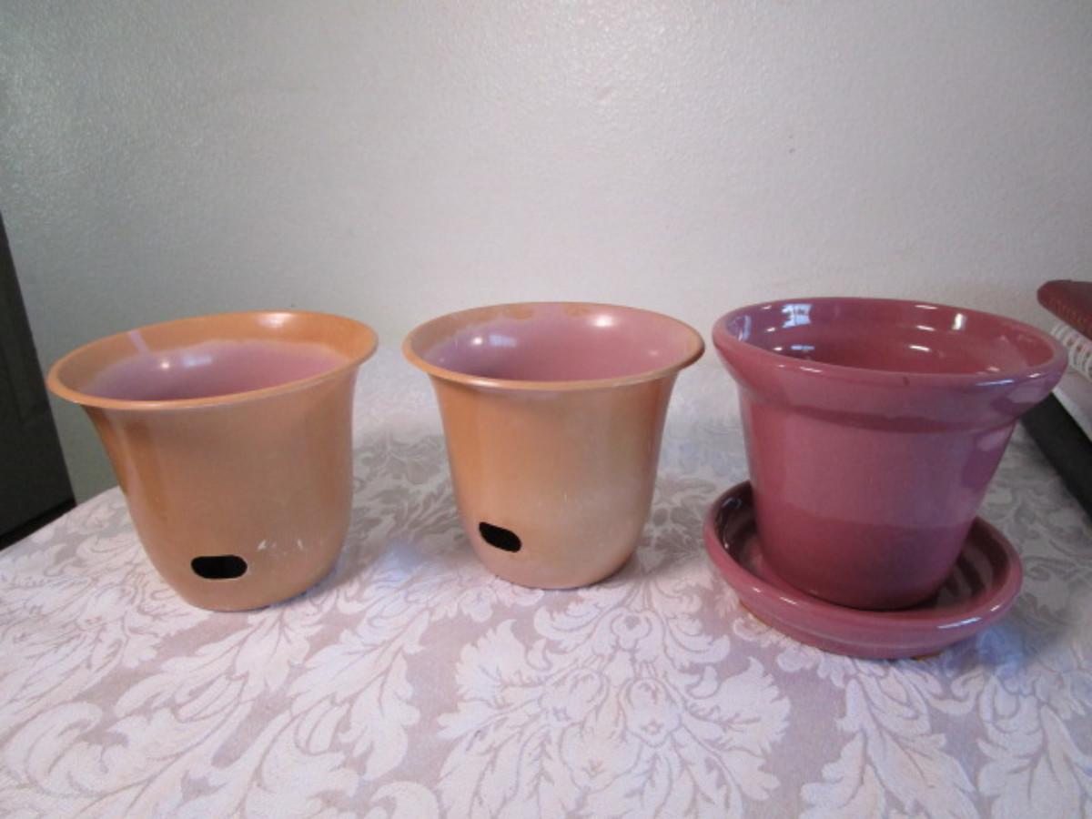 2 plastic self-watering pots, 1 ceramic pot with saucer