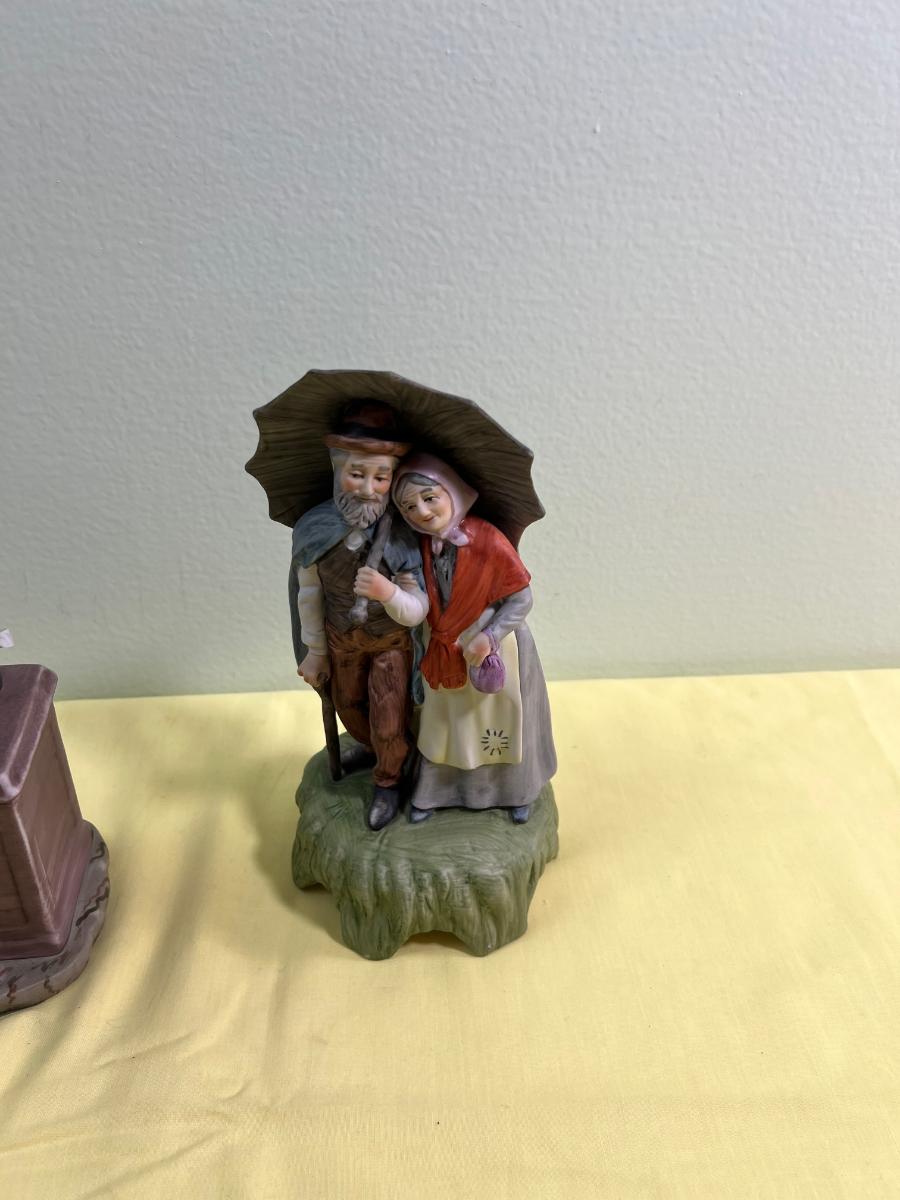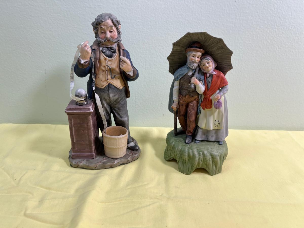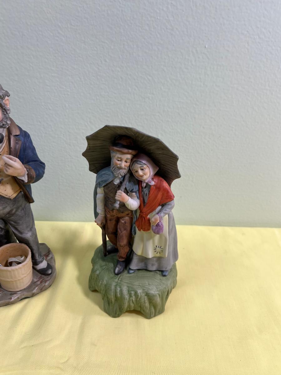 2 Porcelain Bisque Figurines; Stock Broker and Old Man & Woman w/Umbrella.