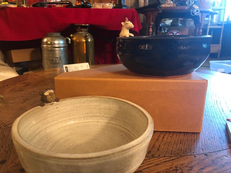 Set of 2 pottery bowls with clay animals hanging from the rim