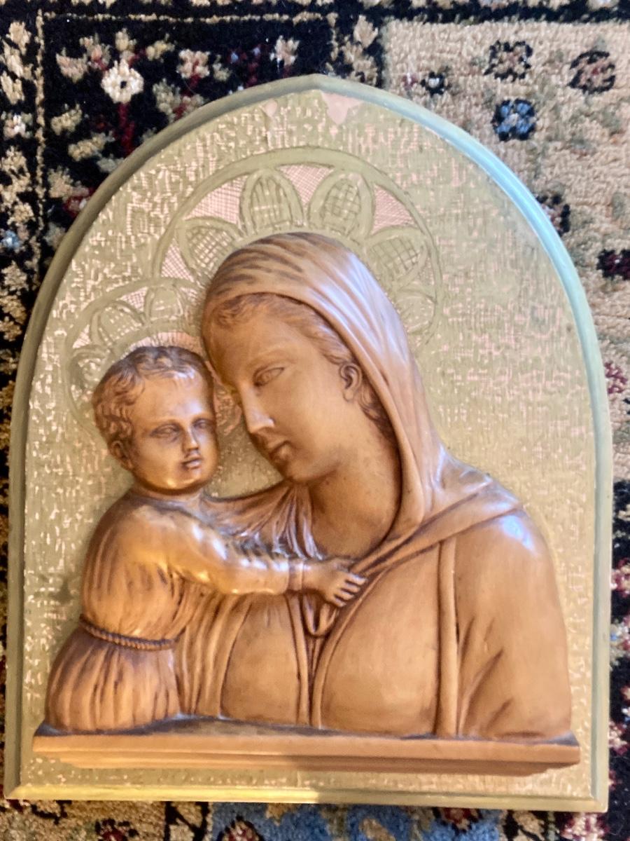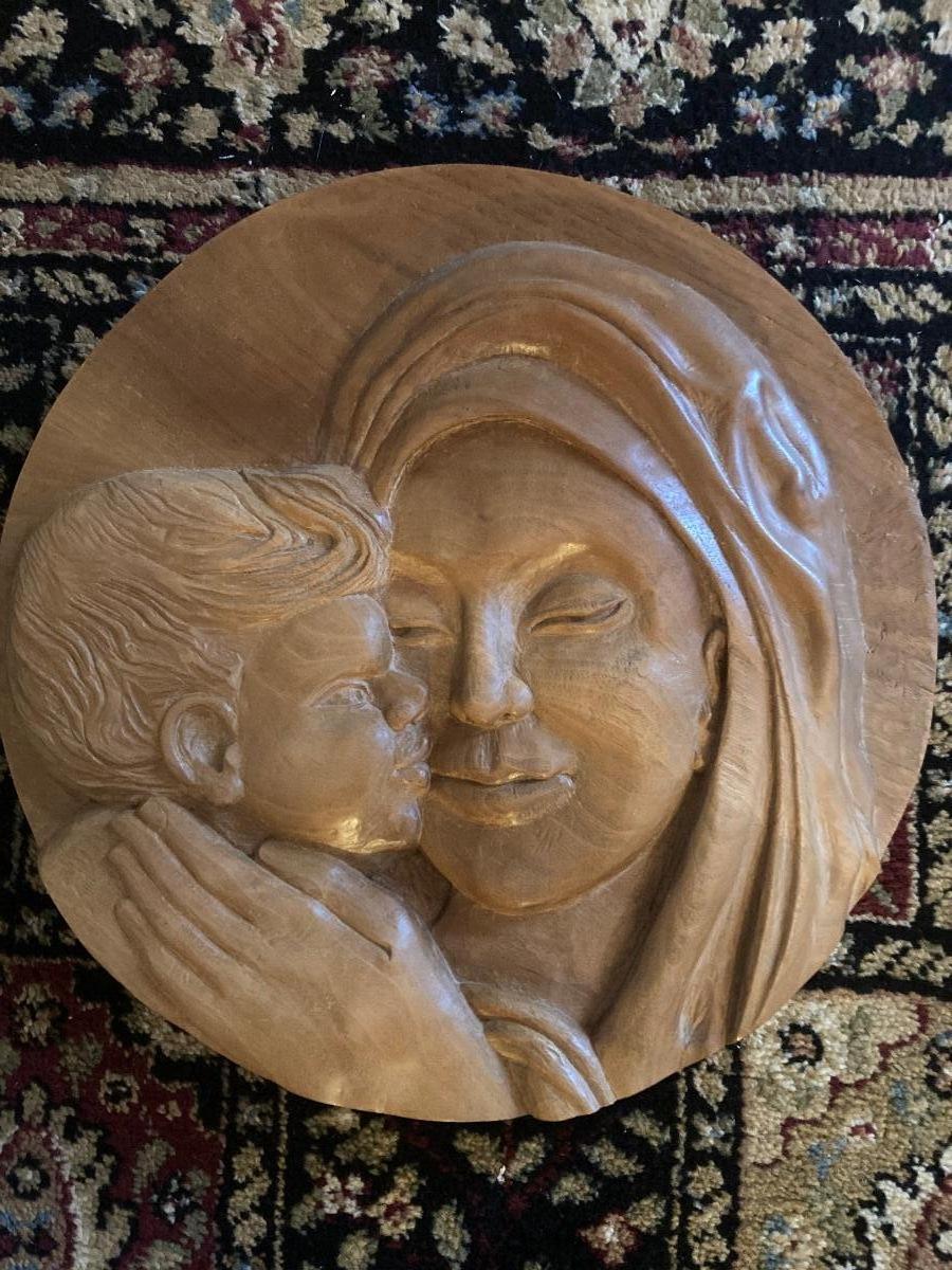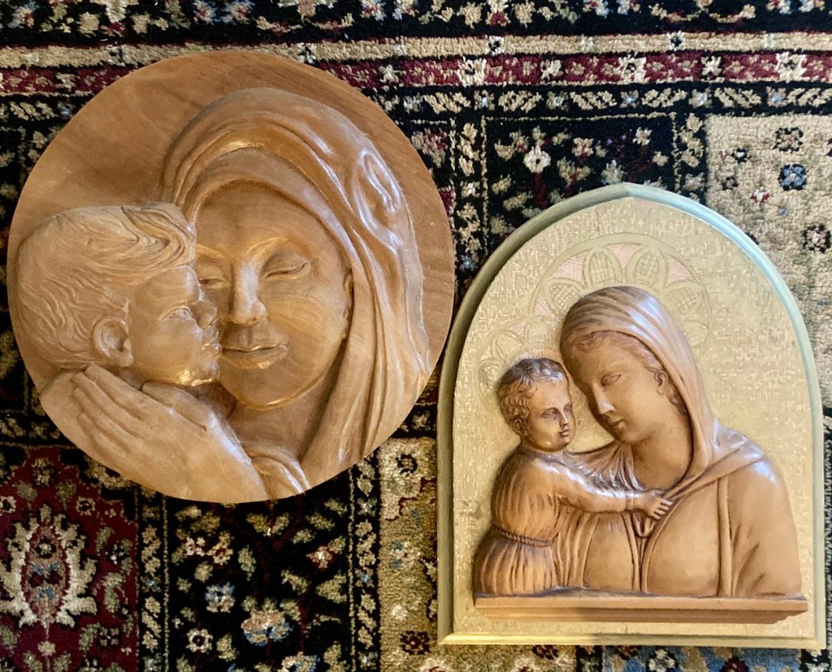 2 wall hanging wood carvings both hand carved. One is lightly painted the other is natural wood. Round diameter is 14"