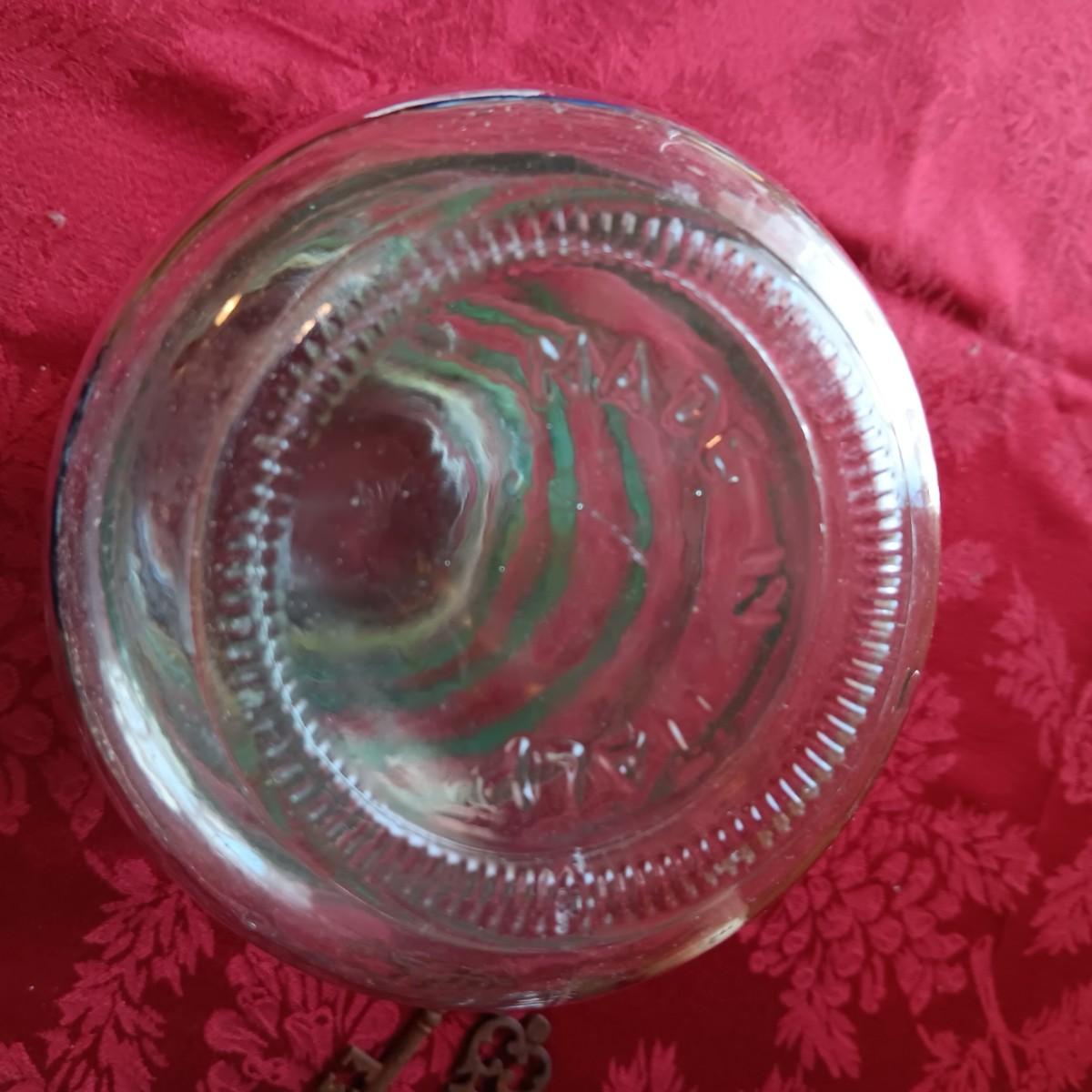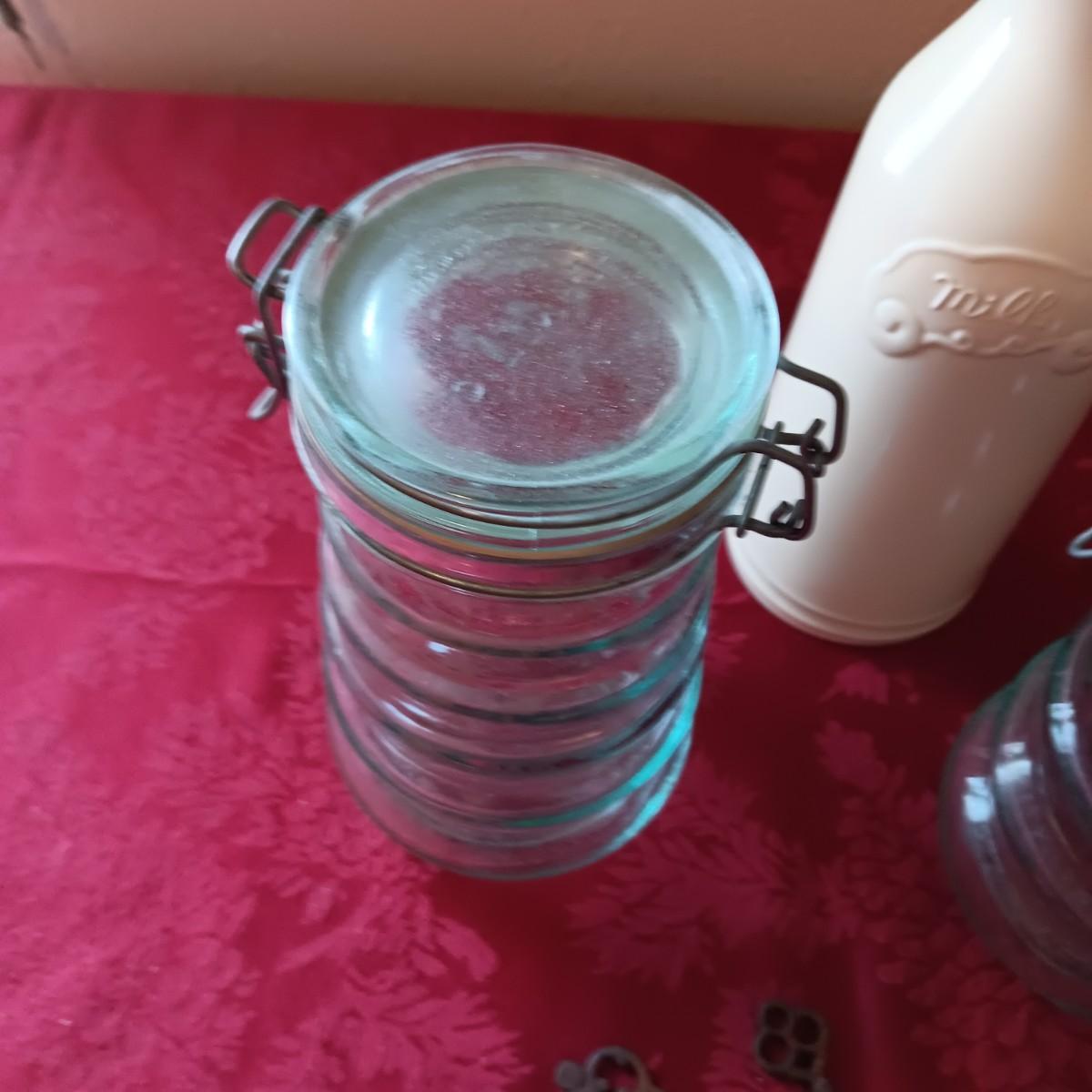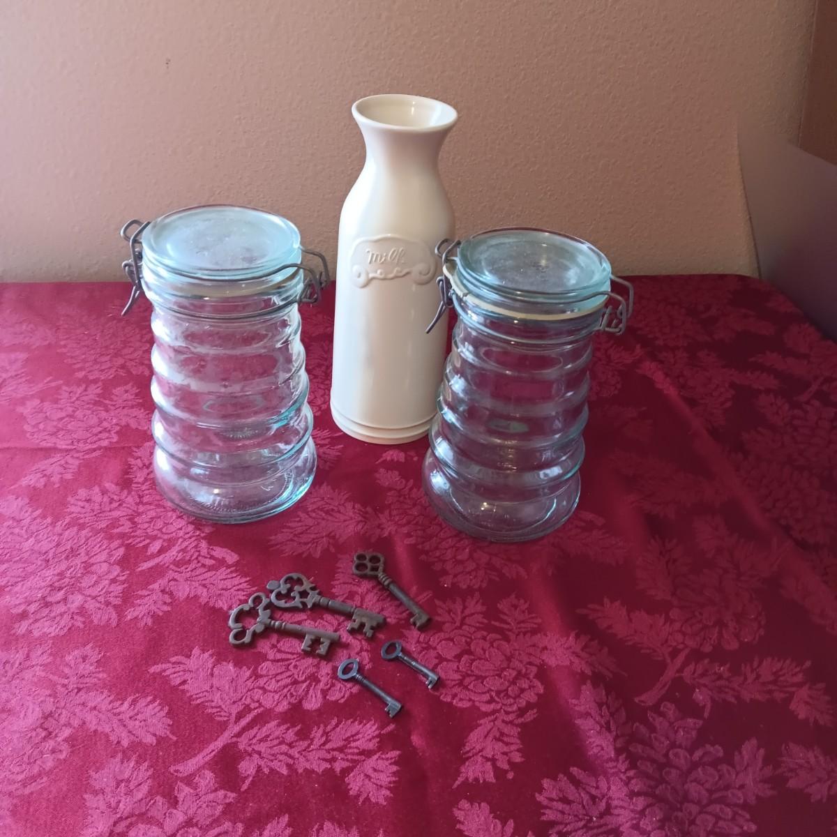 2 RIBBED GLASS JARS MADE IN ITALY, CERAMIC MILK CONTAINER AND SOME SKELETON KEYS