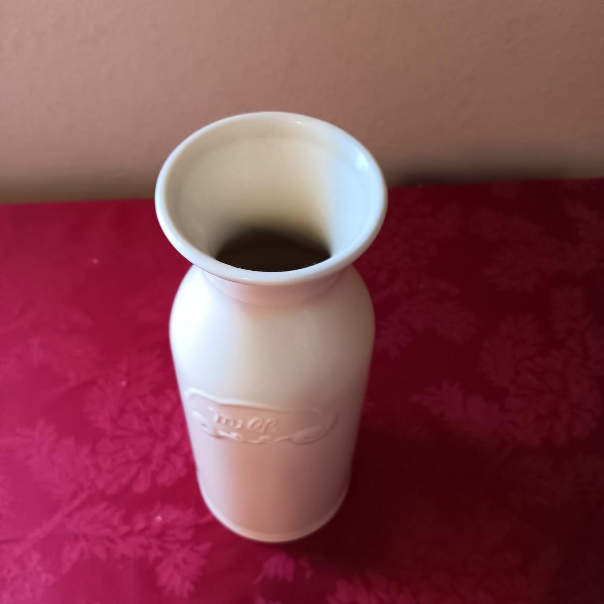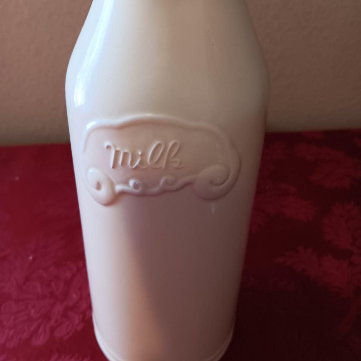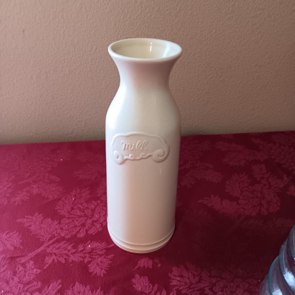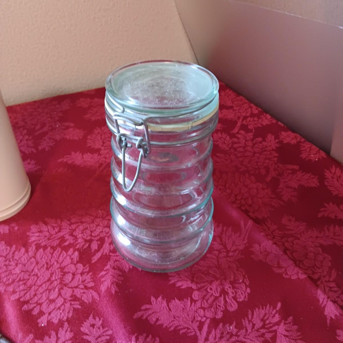 2 RIBBED GLASS JARS MADE IN ITALY, CERAMIC MILK CONTAINER AND SOME SKELETON KEYS
