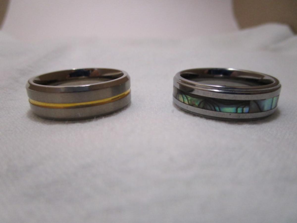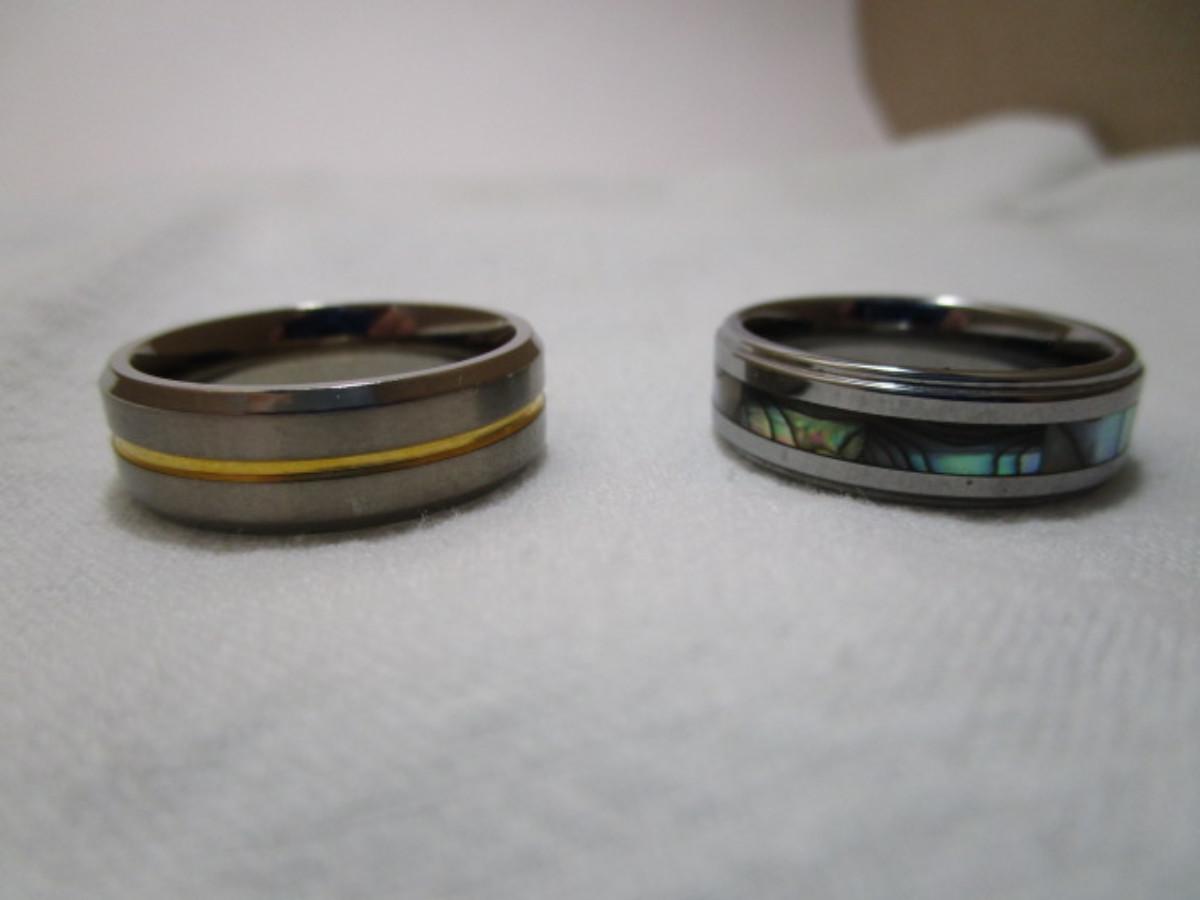 2 rings one is titanium with gold stripe size 12, one is mother of pearl size 13